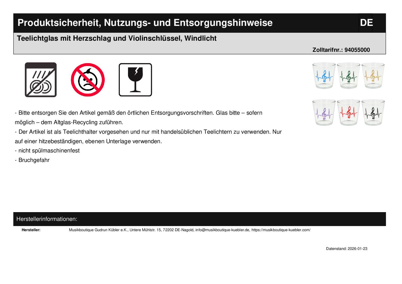 | Titel | Teelichtglas mit Herzschlag und Violinschlüssel, Windlicht |