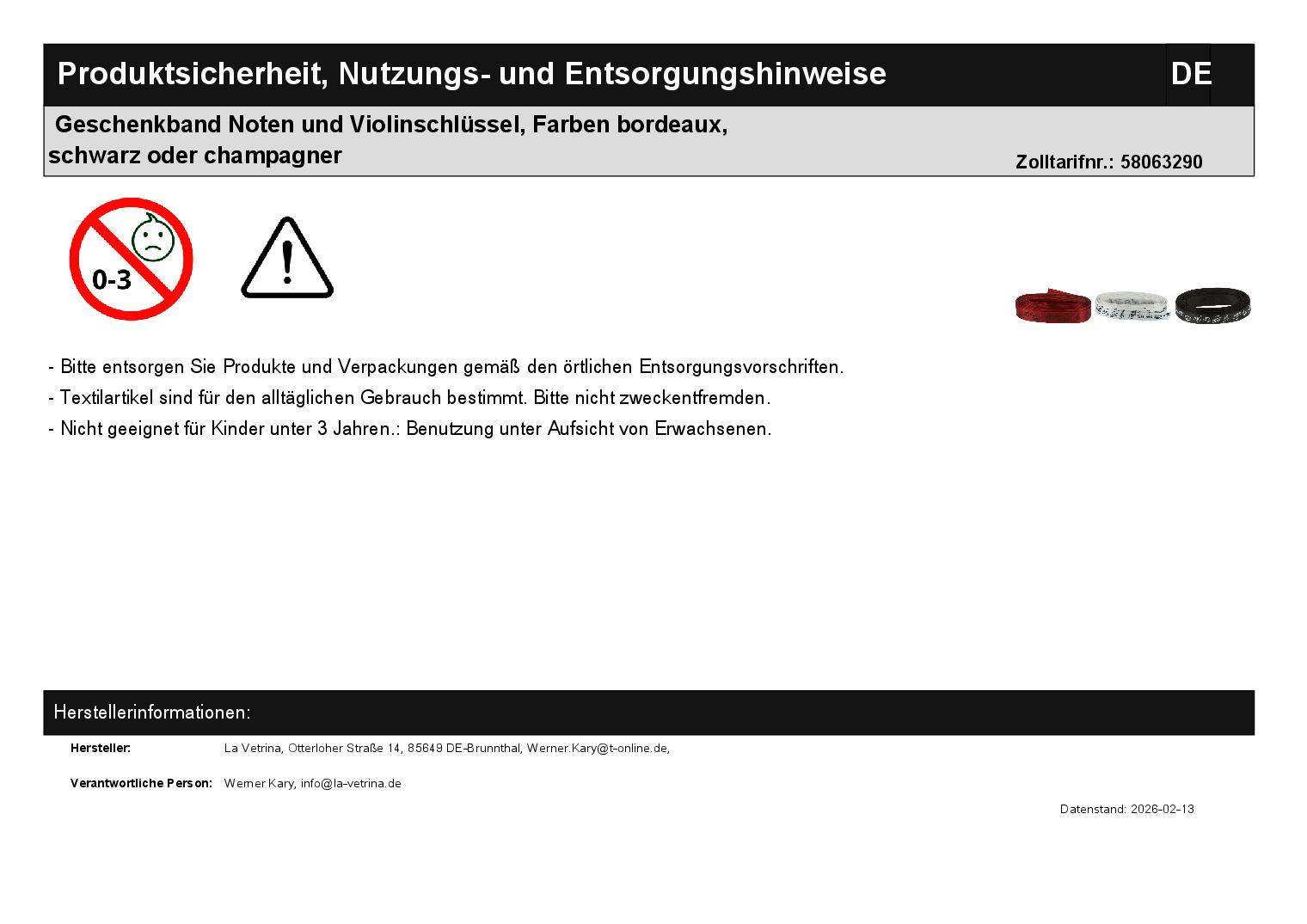 | Titel | Geschenkband Noten und Violinschlüssel, Farben bordeaux, schwarz oder champagner |