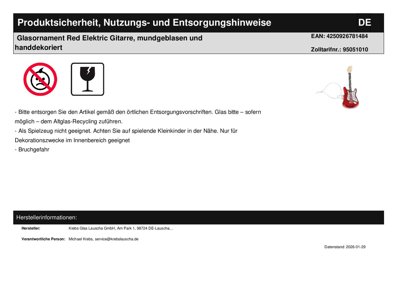 | Titel | Glasornament Red Elektric Gitarre, mundgeblasen und handdekoriert |