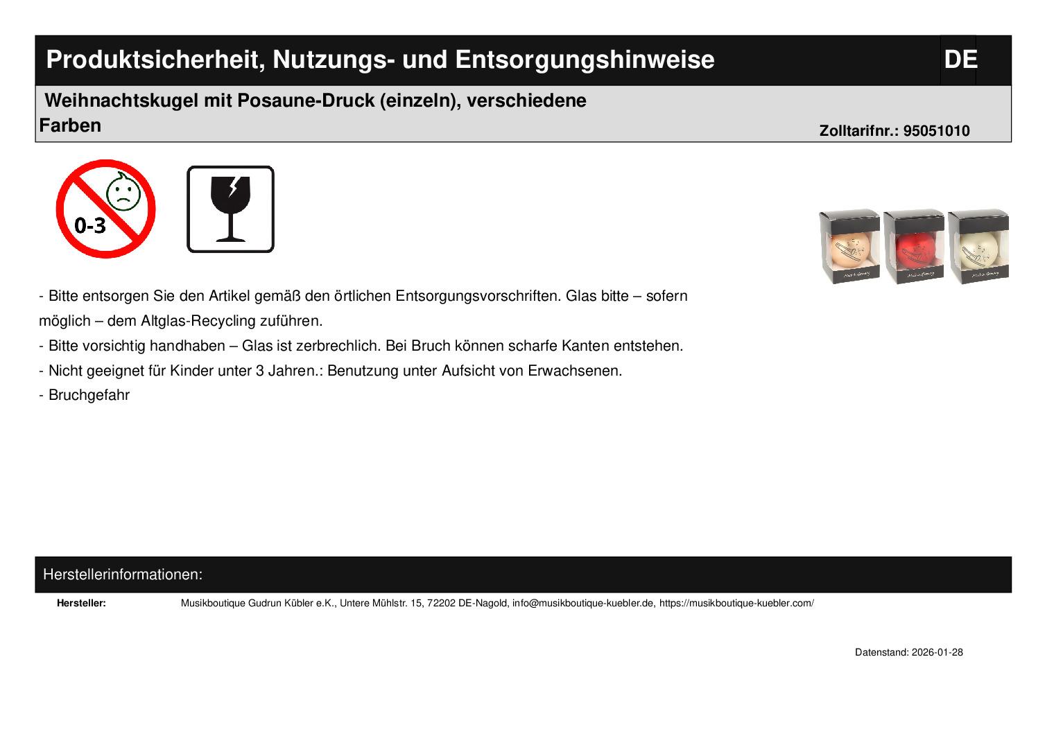| Titel | Weihnachtskugel mit Posaune-Druck (einzeln), verschiedene Farben |