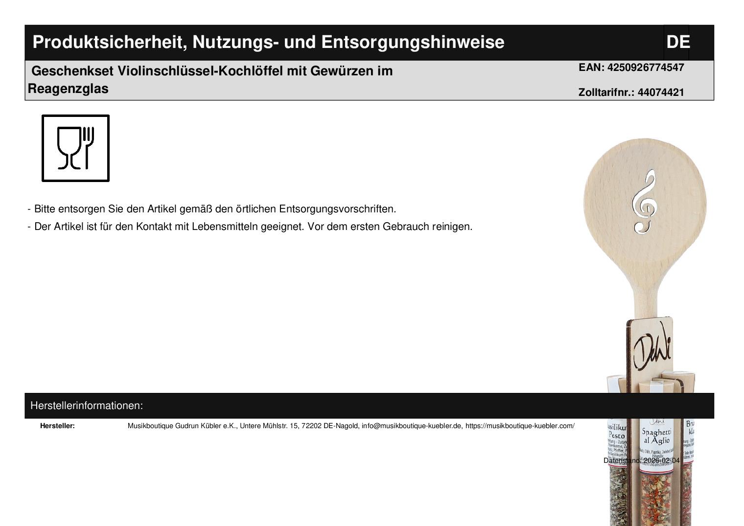 | Titel | Geschenkset Violinschlüssel-Kochlöffel mit Gewürzen im Reagenzglas |