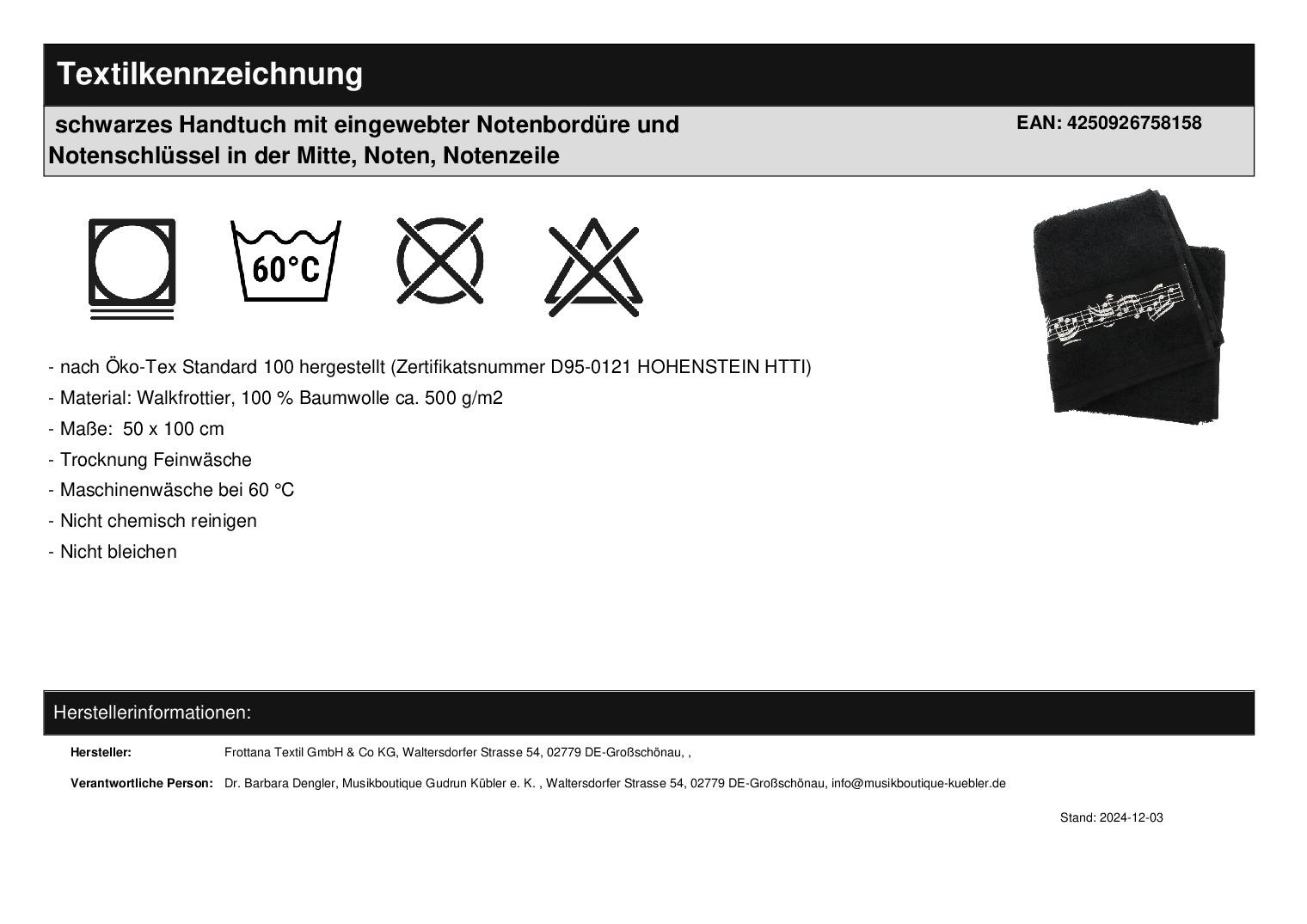1 x schwarzes Handtuch mit eingewebter Notenbordüre und Notenschlüssel - Größe: ca. 50 x 100 cm