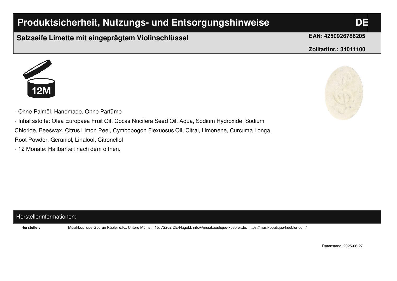 1 x Salzseife Limette mit eingeprägtem Violinschlüssel