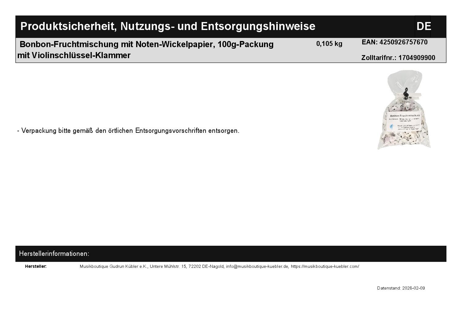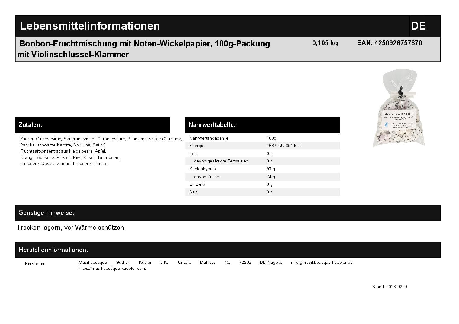| Titel | Bonbon-Fruchtmischung mit Noten-Wickelpapier, 100g-Packung mit Violinschlüssel-Klammer |