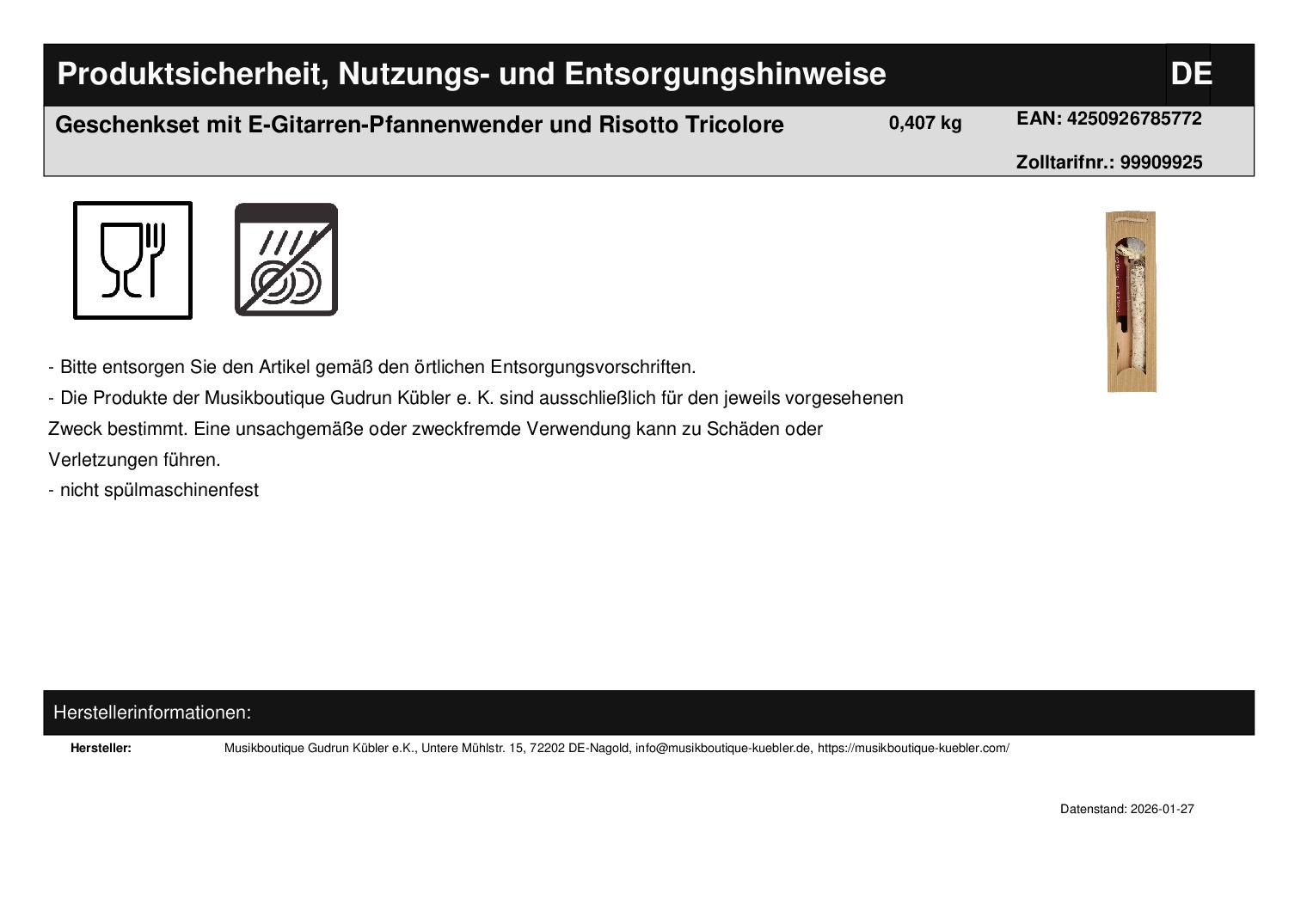 | Titel | Geschenkset mit E-Gitarren-Pfannenwender und Risotto Tricolore |
