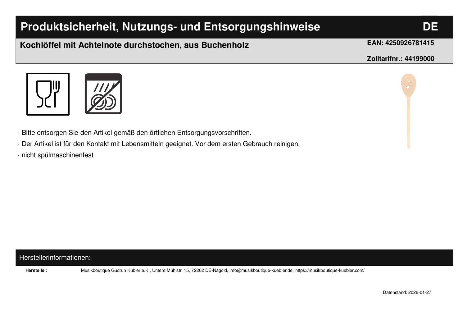 1 x Deko-Kochlöffel mit durchstochener, filigranen Achtelnote oder Violinschlüssel, aus Buchenholz