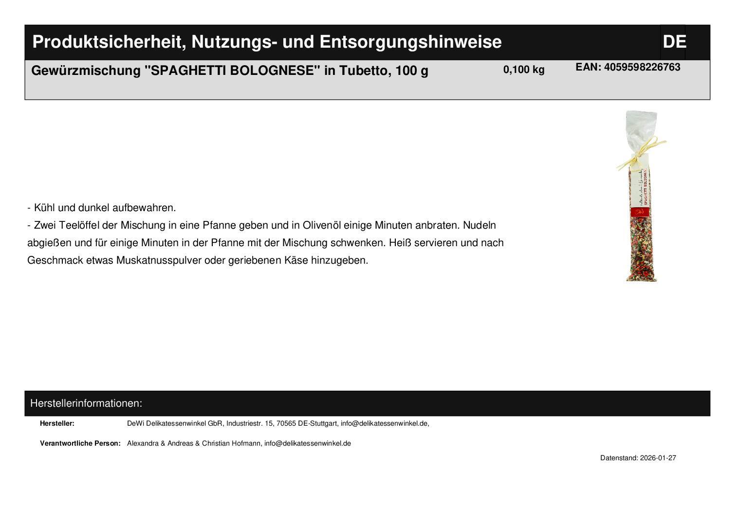 1 x Gewürzmischung "SPAGHETTI BOLOGNESE" in Tubetto, 100 g
