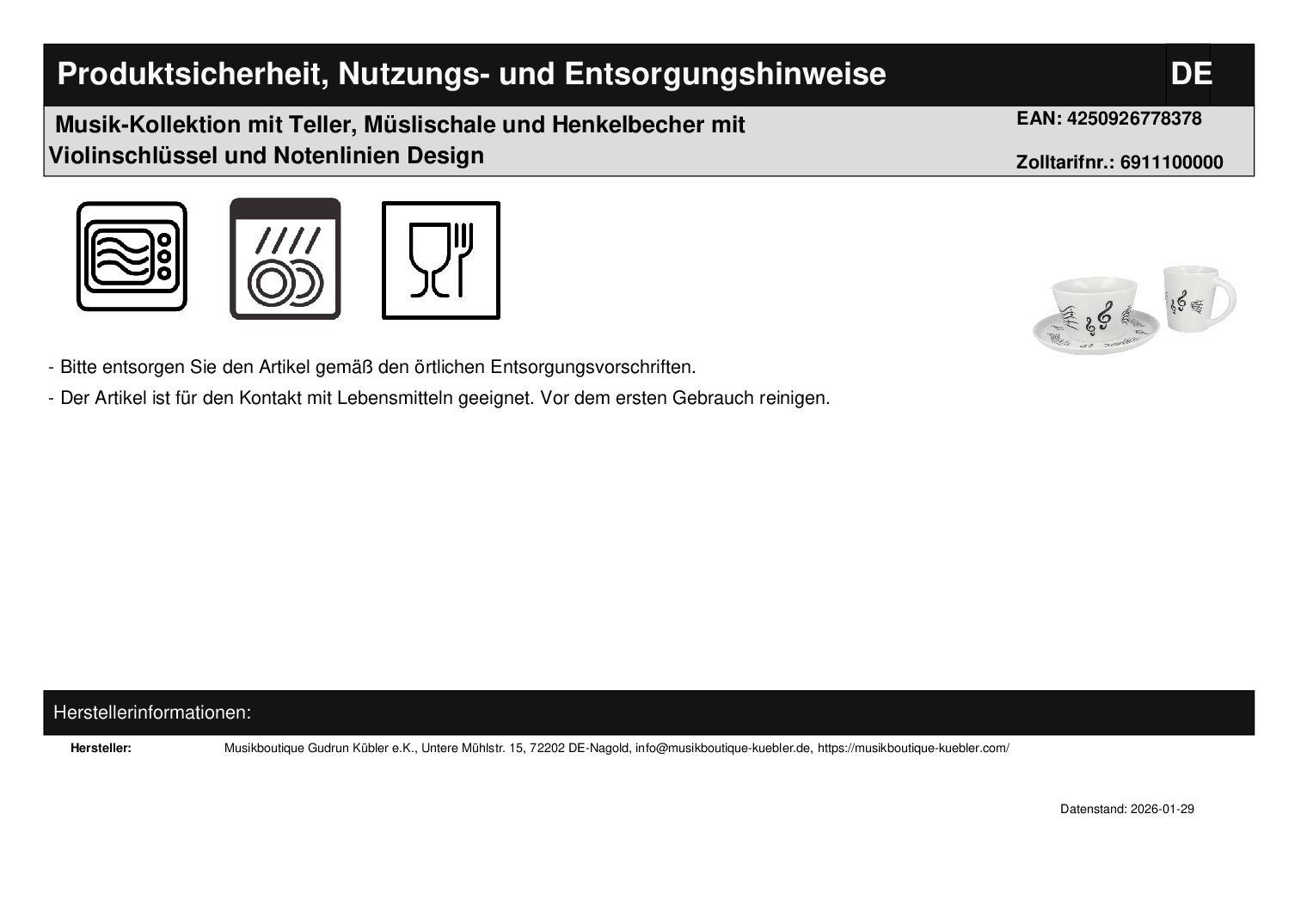 | Titel | Musik-Kollektion mit Teller, Müslischale und Henkelbecher mit Violinschlüssel und Notenlinien Design |