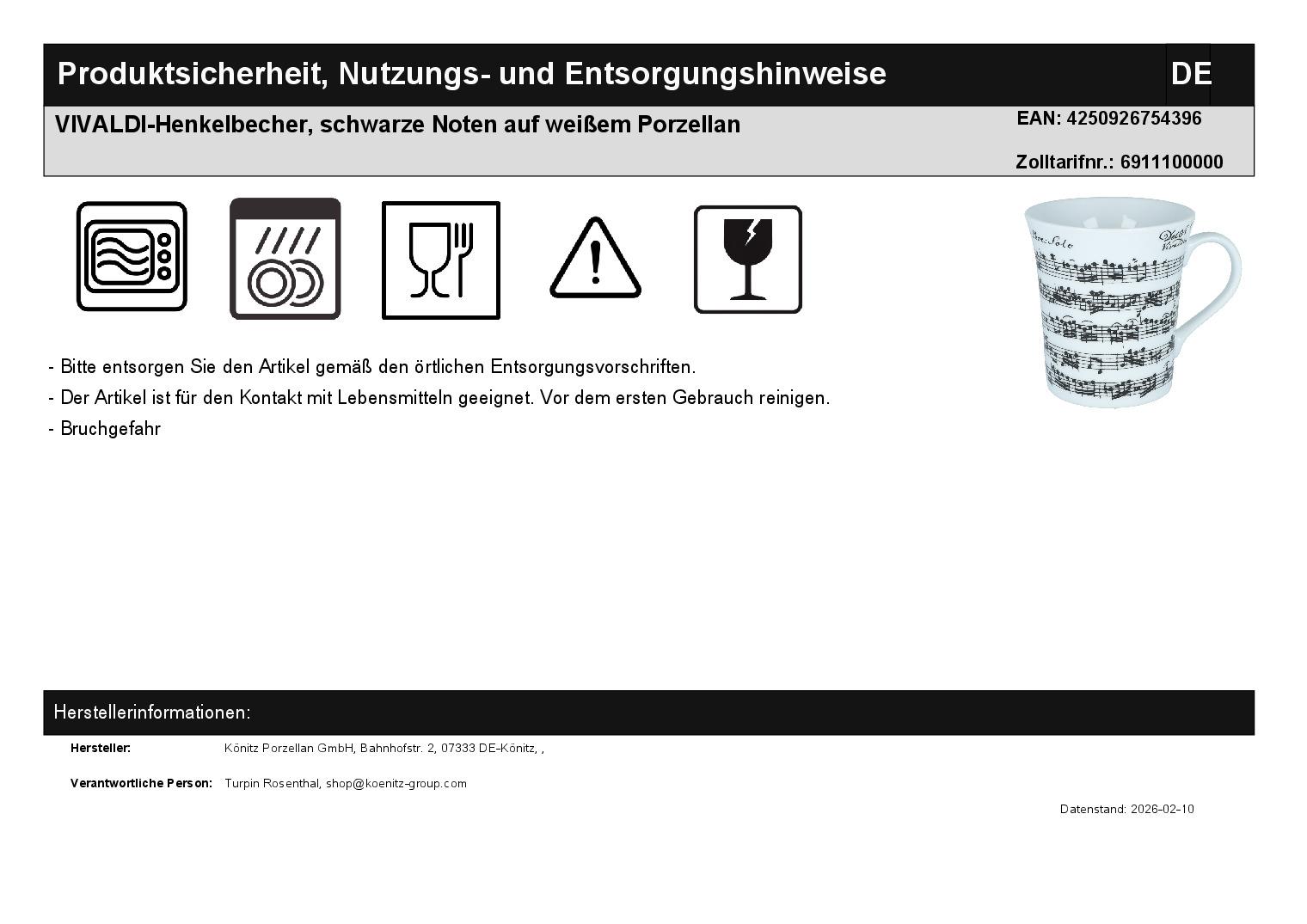 | Titel | VIVALDI-Henkelbecher, schwarze Noten auf weißem Porzellan |