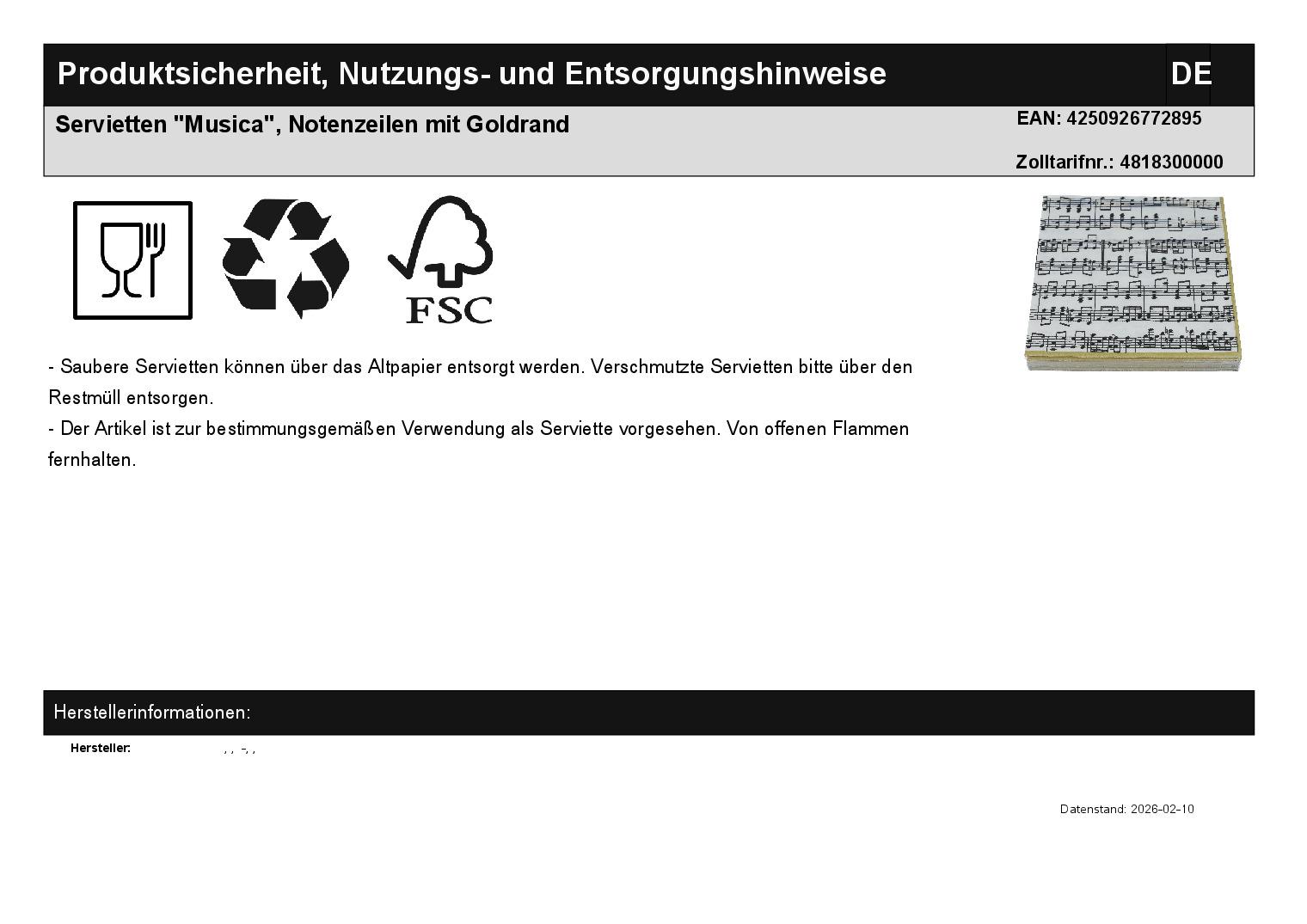 | Titel | Servietten "Musica", Notenzeilen mit Goldrand |
