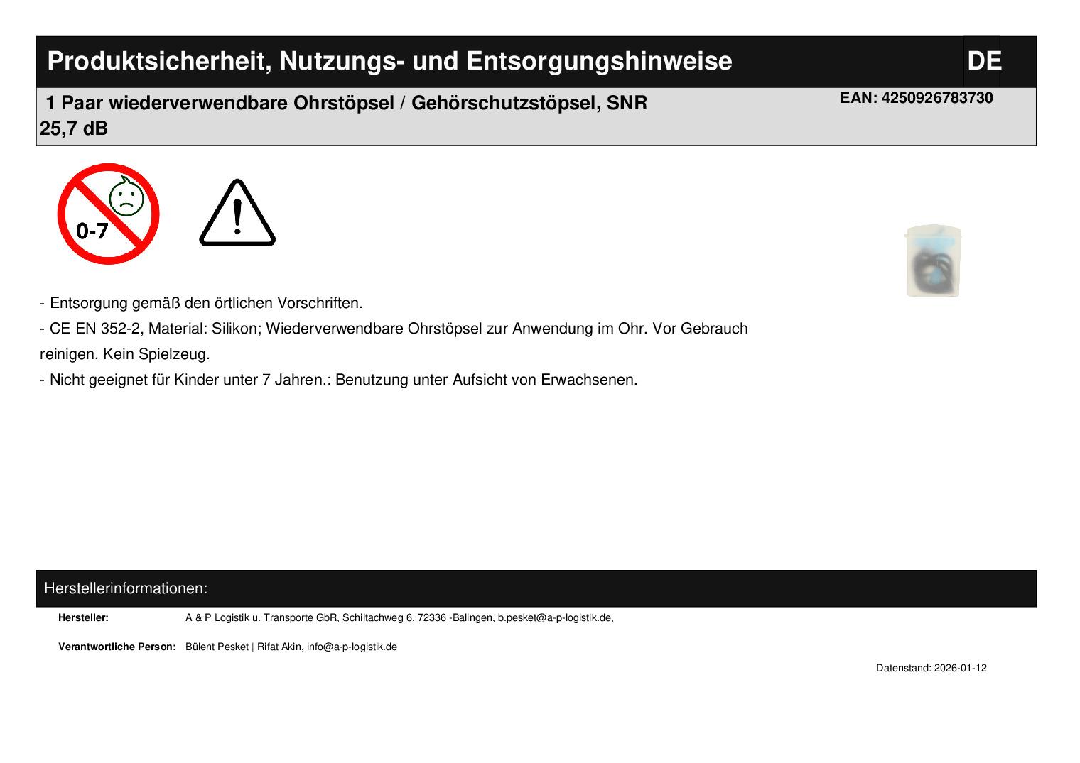 | Titel | 1 Paar wiederverwendbare Ohrstöpsel / Gehörschutzstöpsel, SNR 25,7 dB |