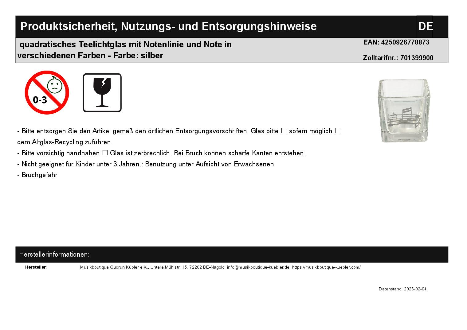| Titel | quadratisches Teelichtglas mit Notenlinie und Note in verschiedenen Farben - Farbe: silber |