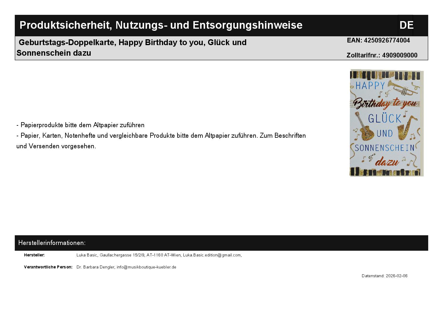 | Titel | Geburtstags-Doppelkarte, Happy Birthday to you, Glück und Sonnenschein dazu |