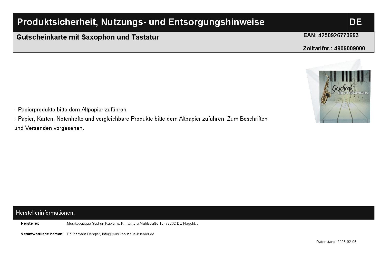 | Titel | Gutscheinkarte mit Saxophon und Tastatur |