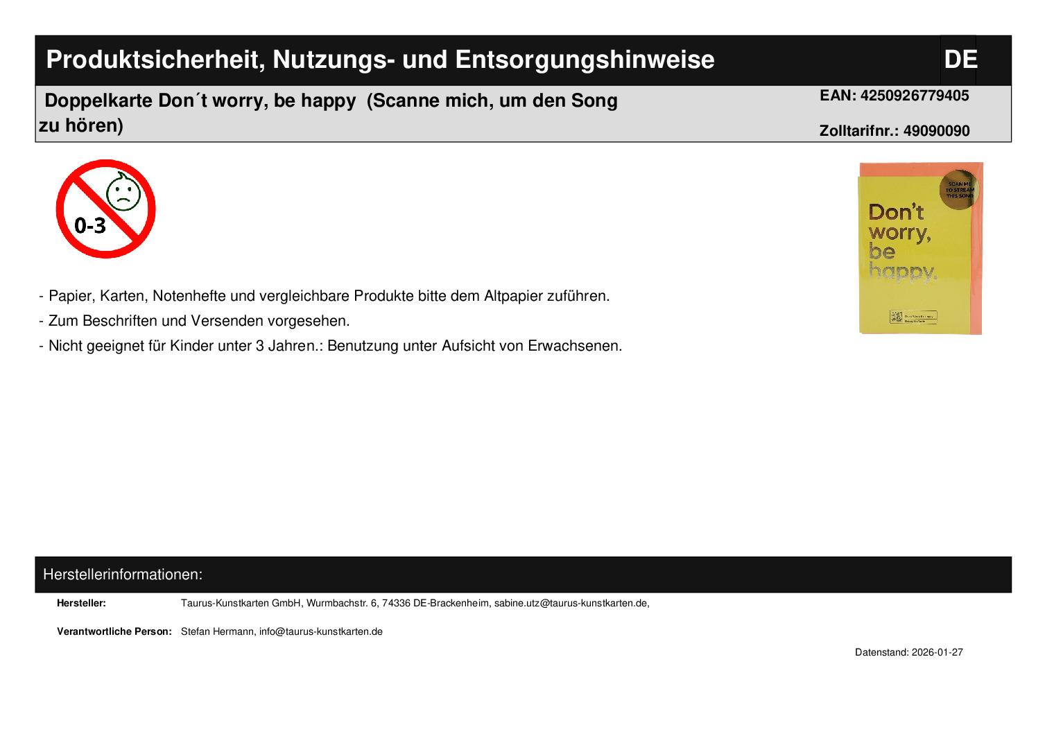 | Titel | Doppelkarte Don´t worry, be happy (Scanne mich, um den Song zu hören) |