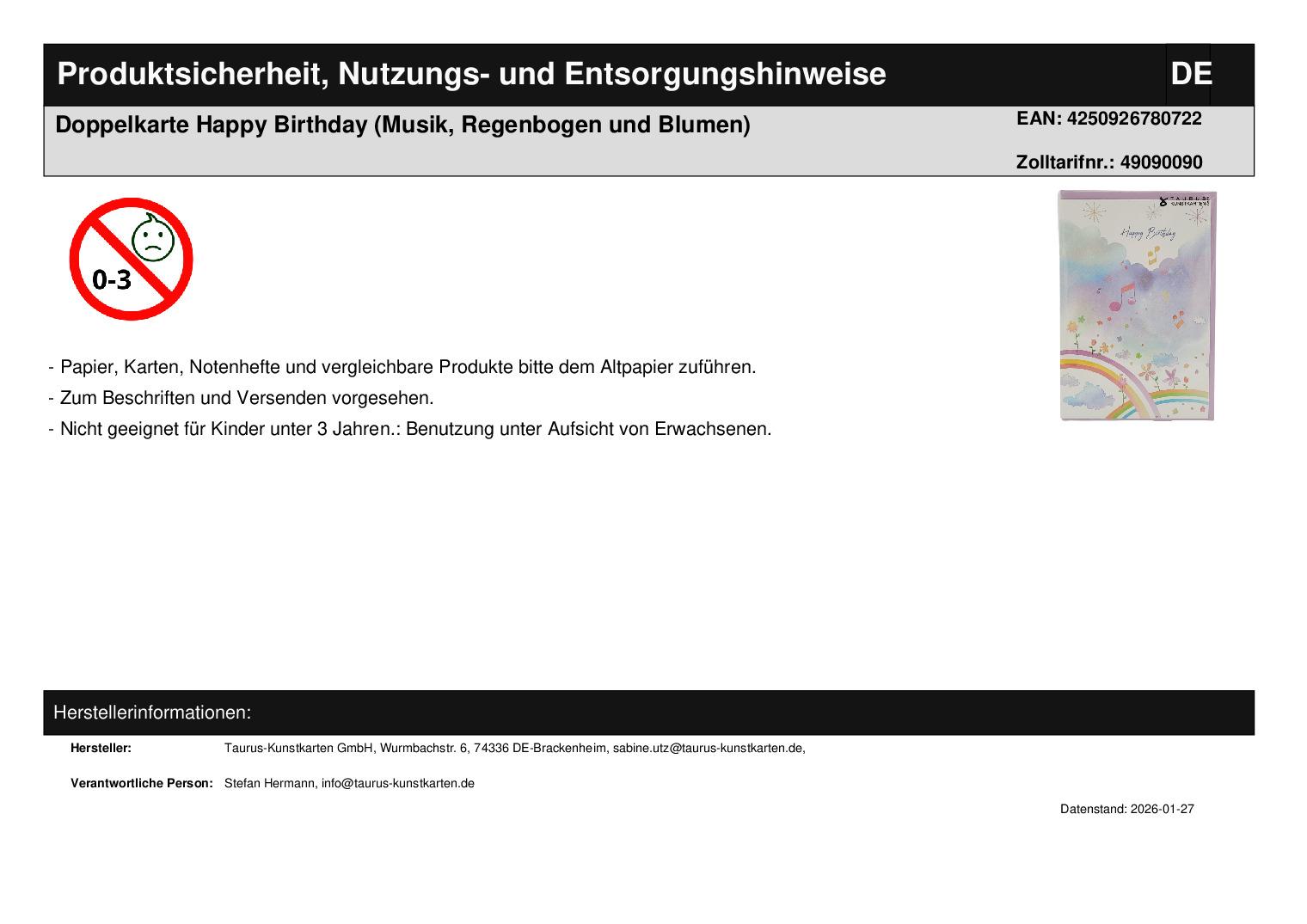 | Titel | Doppelkarte Happy Birthday (Musik, Regenbogen und Blumen) |