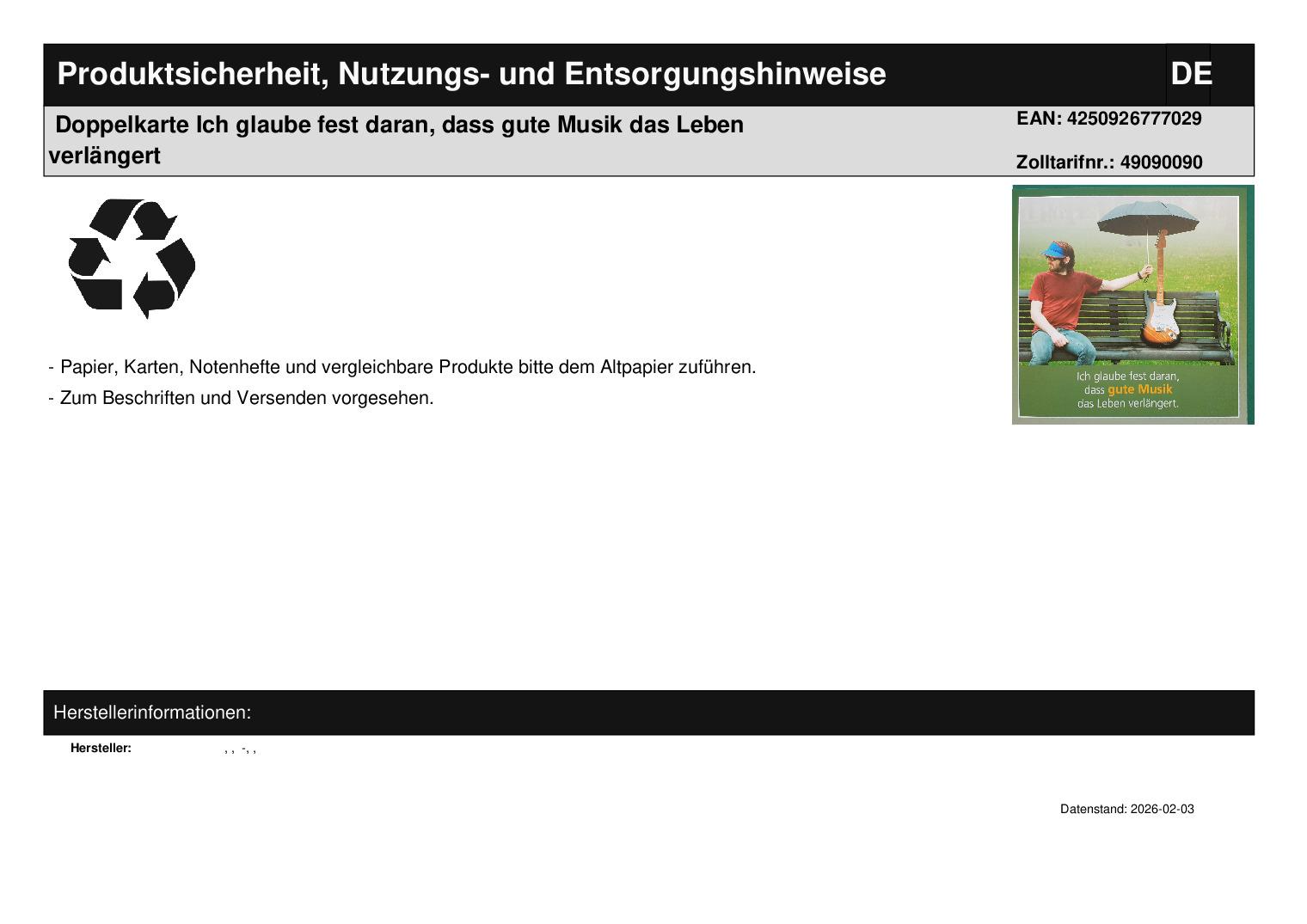 | Titel | Doppelkarte Ich glaube fest daran, dass gute Musik das Leben verlängert |