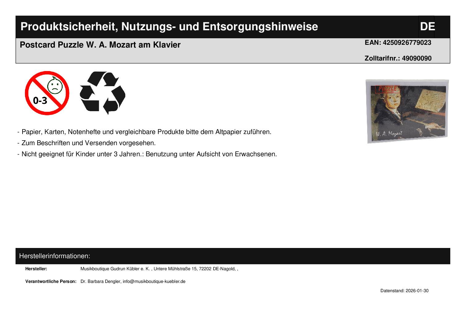| Titel | Postcard Puzzle W. A. Mozart am Klavier |