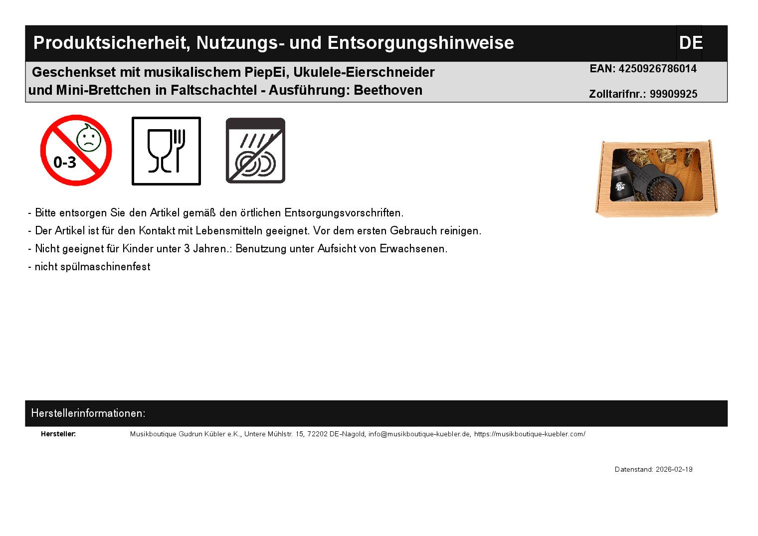 | Titel | Geschenkset mit musikalischem PiepEi, Ukulele-Eierschneider und Mini-Brettchen in Faltschachtel |