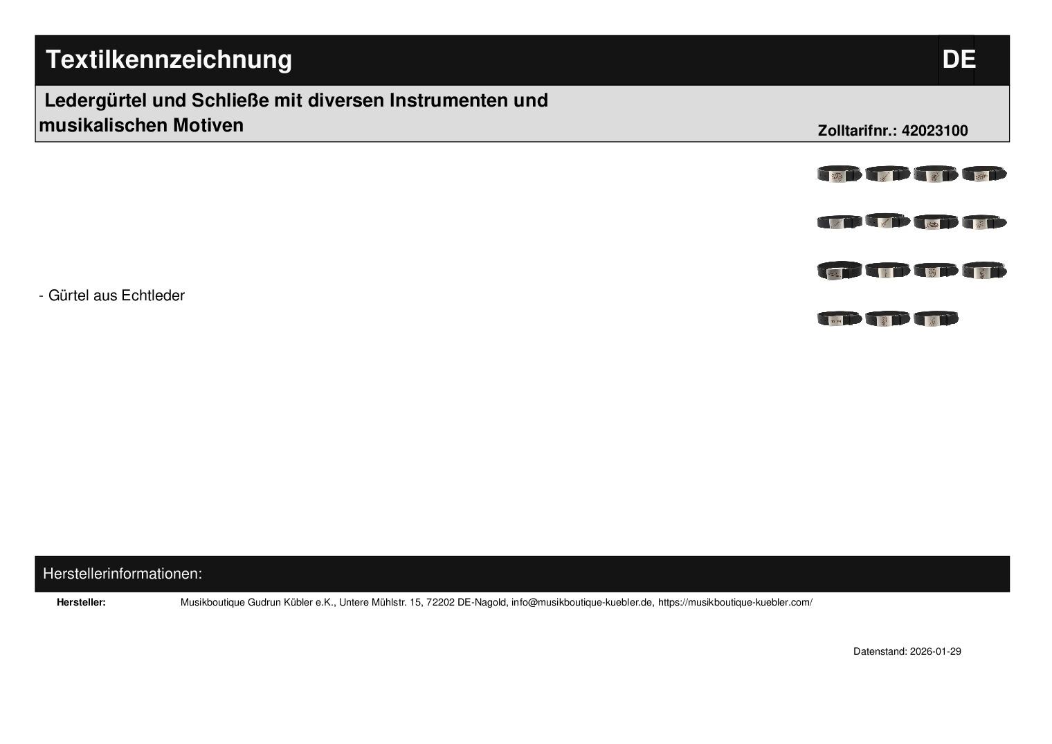 | Textil Materialkennzeichnung (Text) | Gürtel aus Echtleder |
