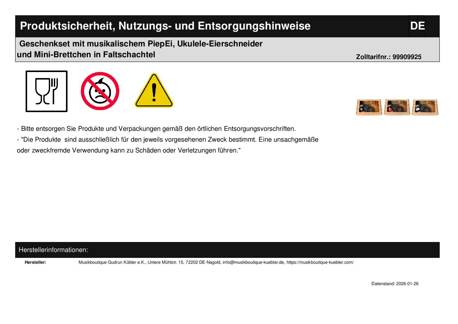 | Titel | Geschenkset mit musikalischem PiepEi, Ukulele-Eierschneider und Mini-Brettchen in Faltschachtel |