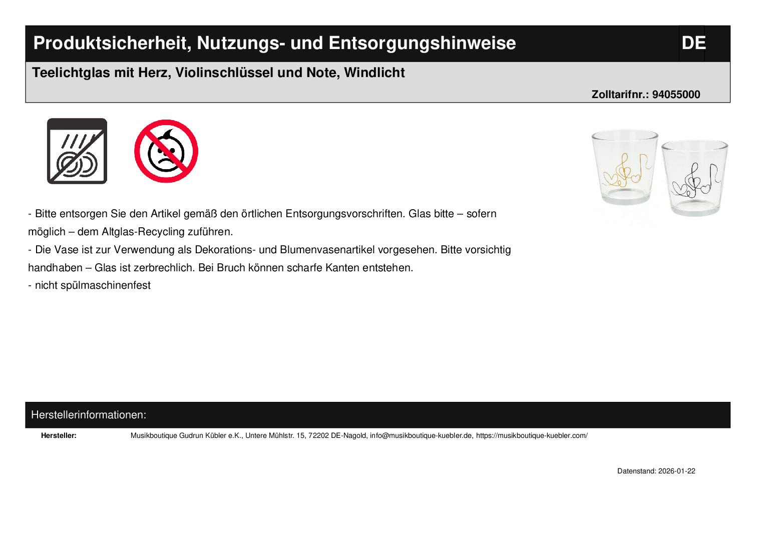| Titel | Teelichtglas mit Herz, Violinschlüssel und Note, Windlicht |