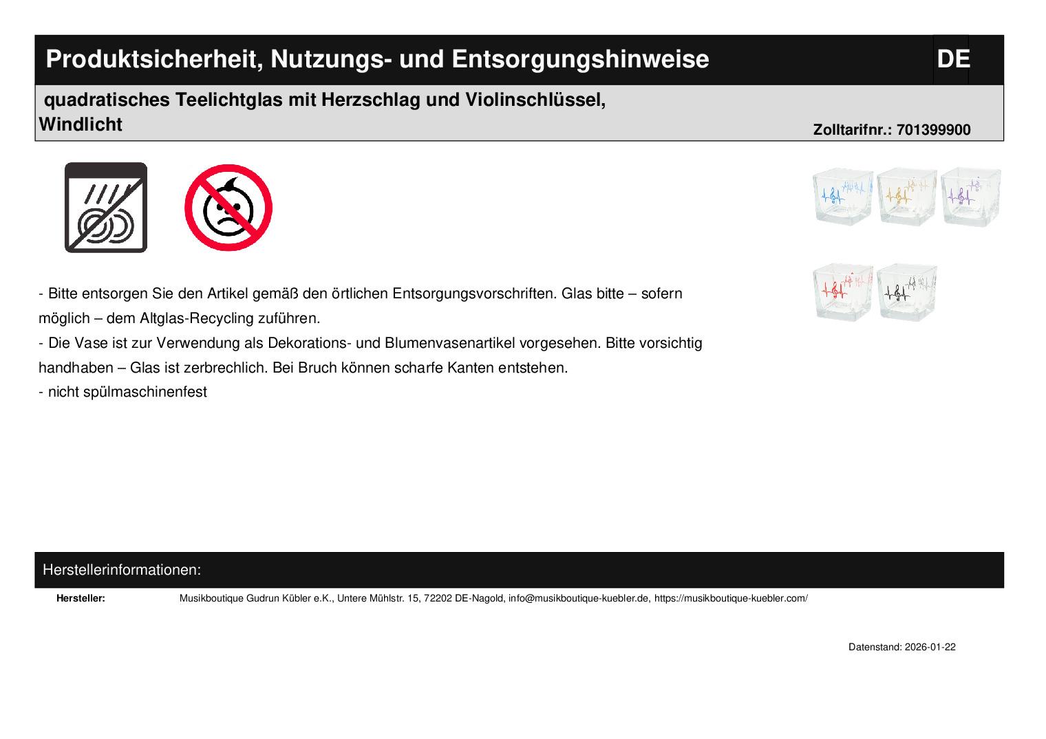 | Titel | quadratisches Teelichtglas mit Herzschlag und Violinschlüssel, Windlicht |