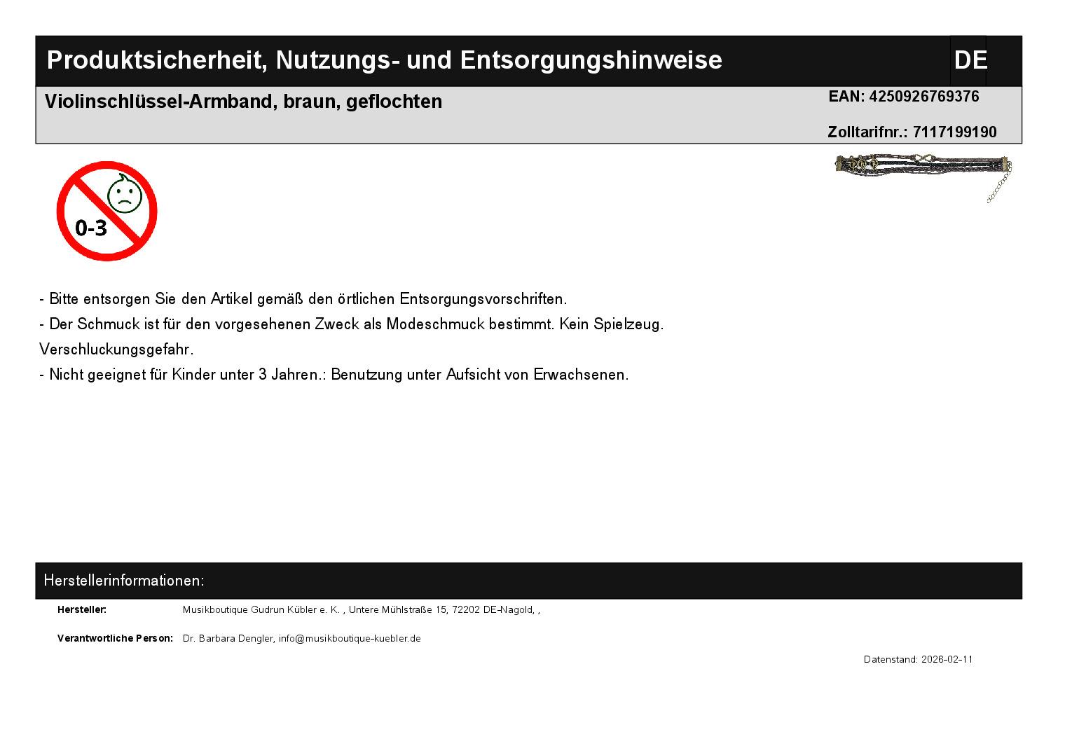 | Titel | Violinschlüssel-Armband, braun, geflochten |