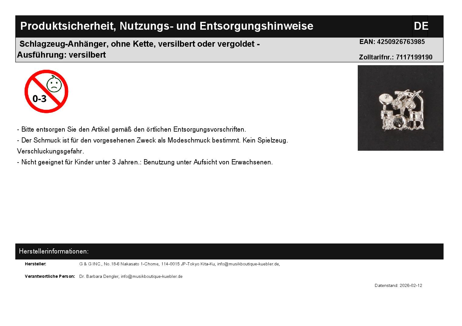 | Titel | Schlagzeug-Anhänger, ohne Kette, versilbert oder vergoldet |
