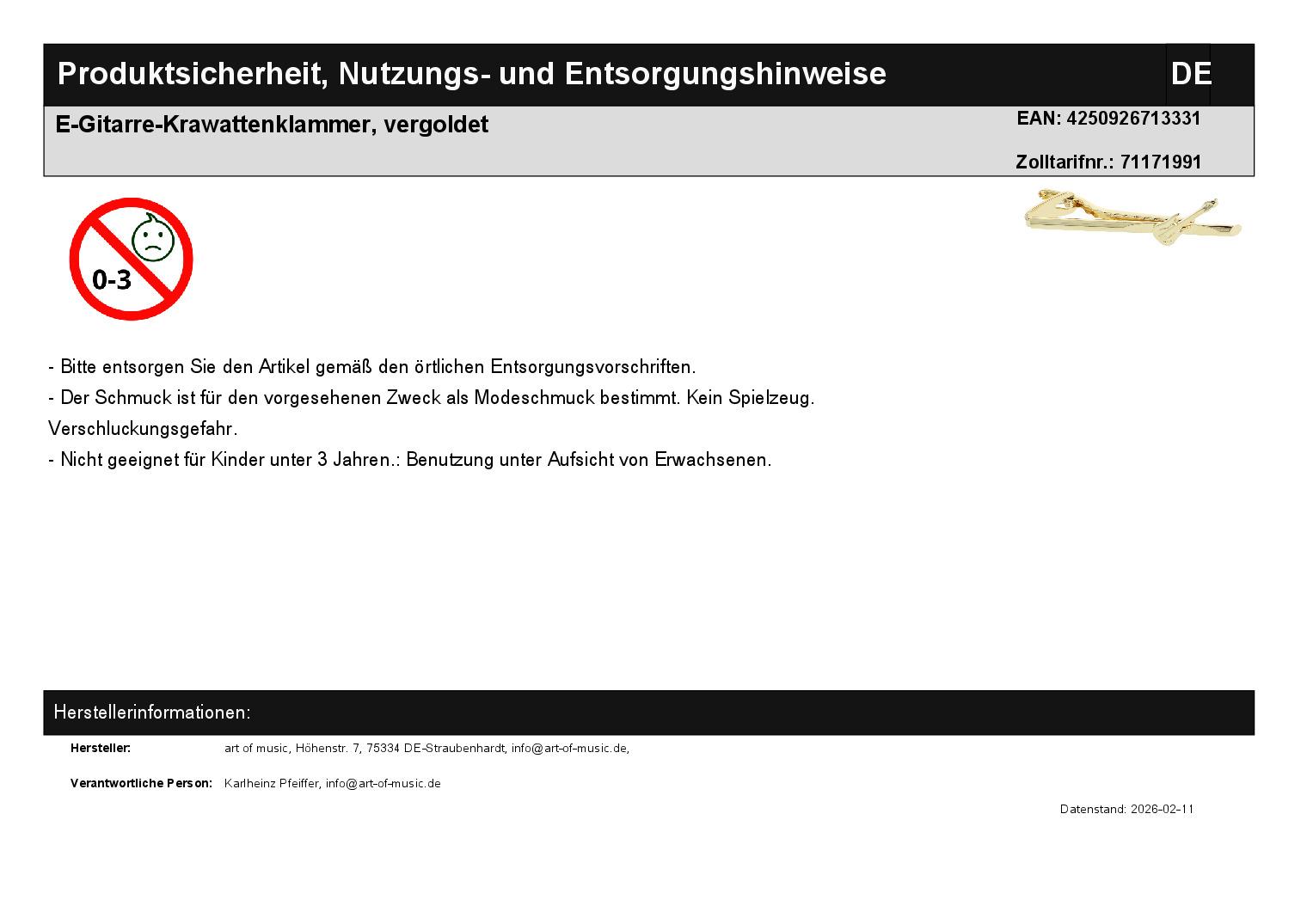 | Titel | E-Gitarre-Krawattenklammer, vergoldet |