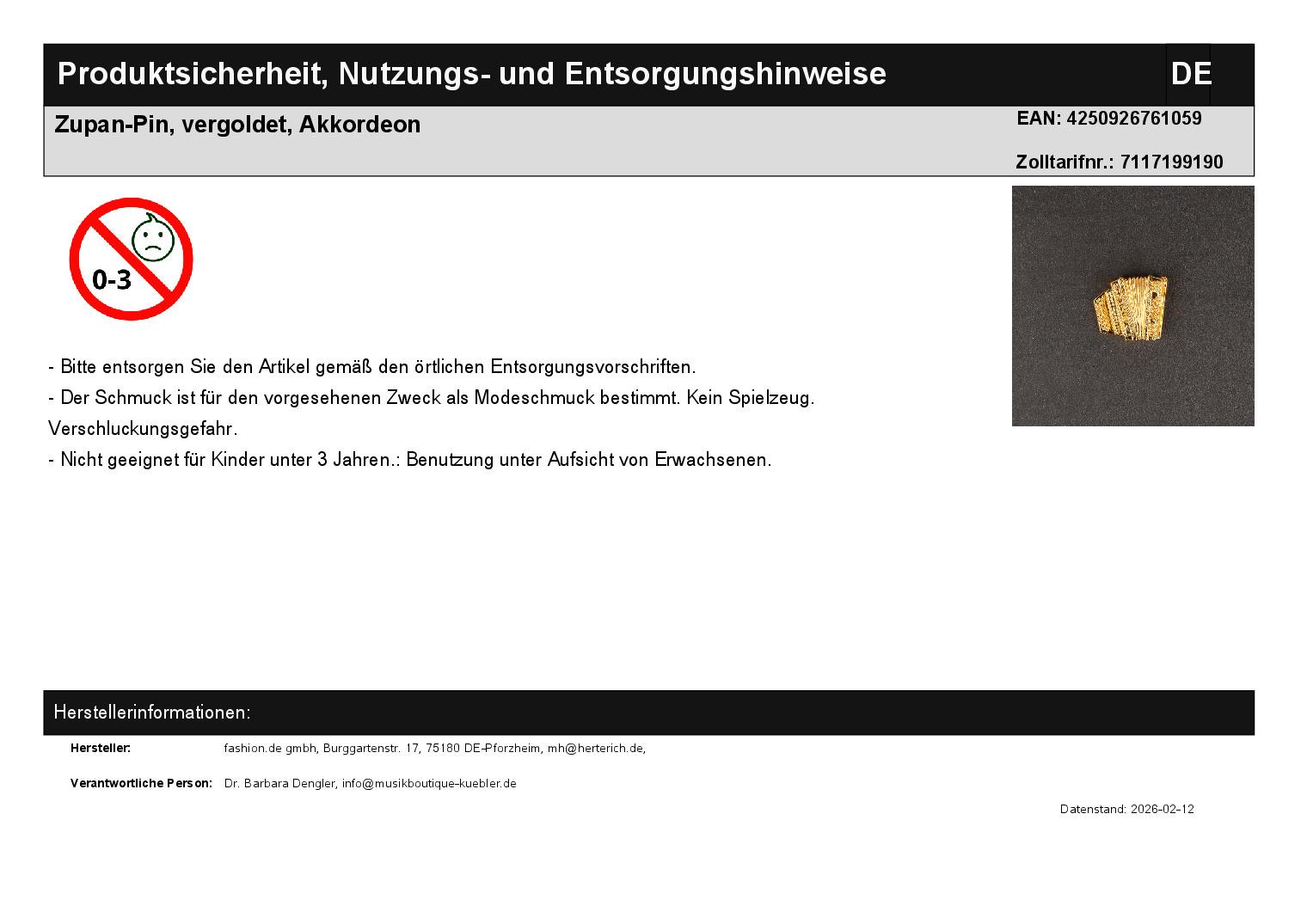 | Titel | Zupan-Pin, vergoldet, Akkordeon |