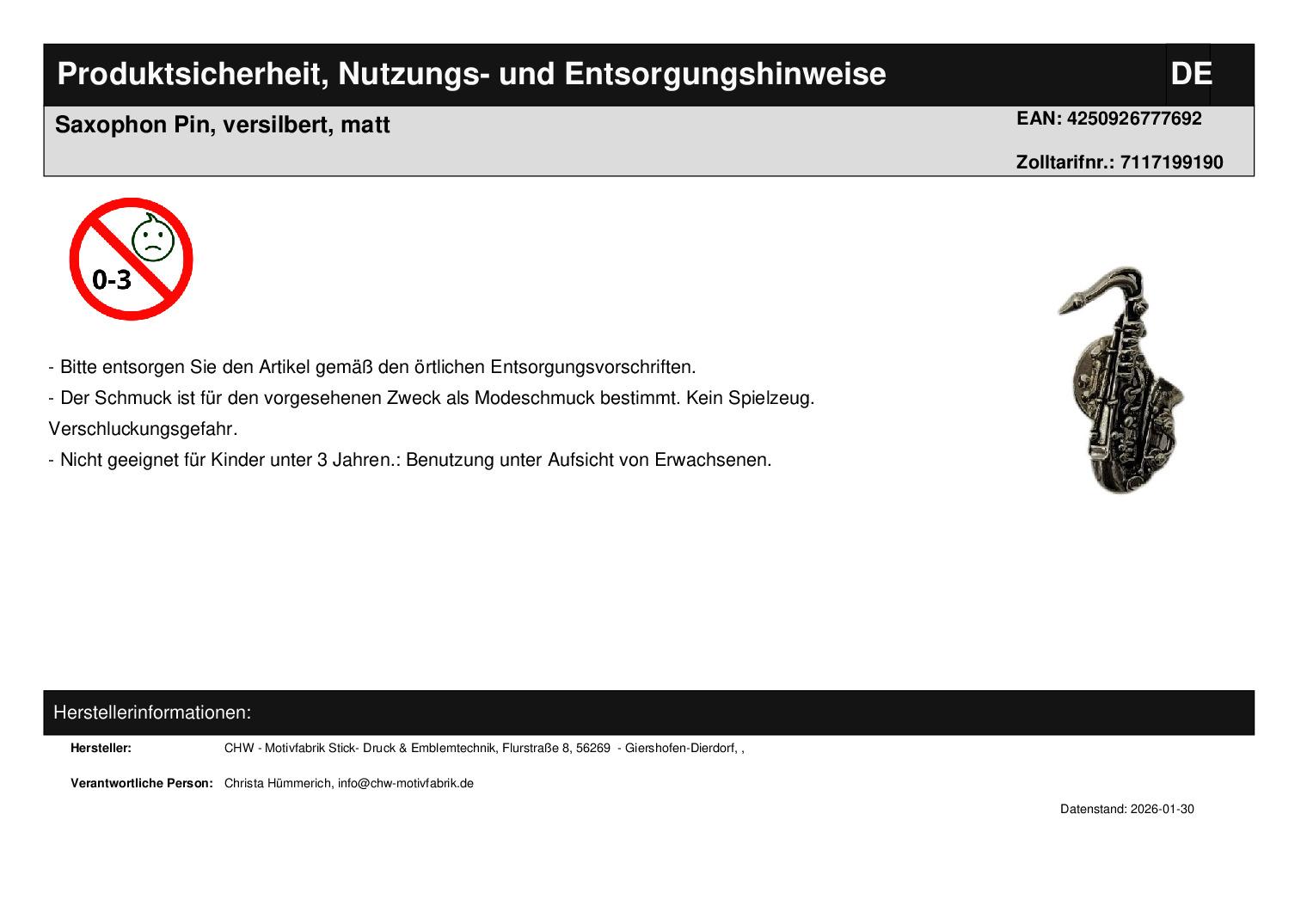 | Titel | Saxophon Pin, versilbert, matt |