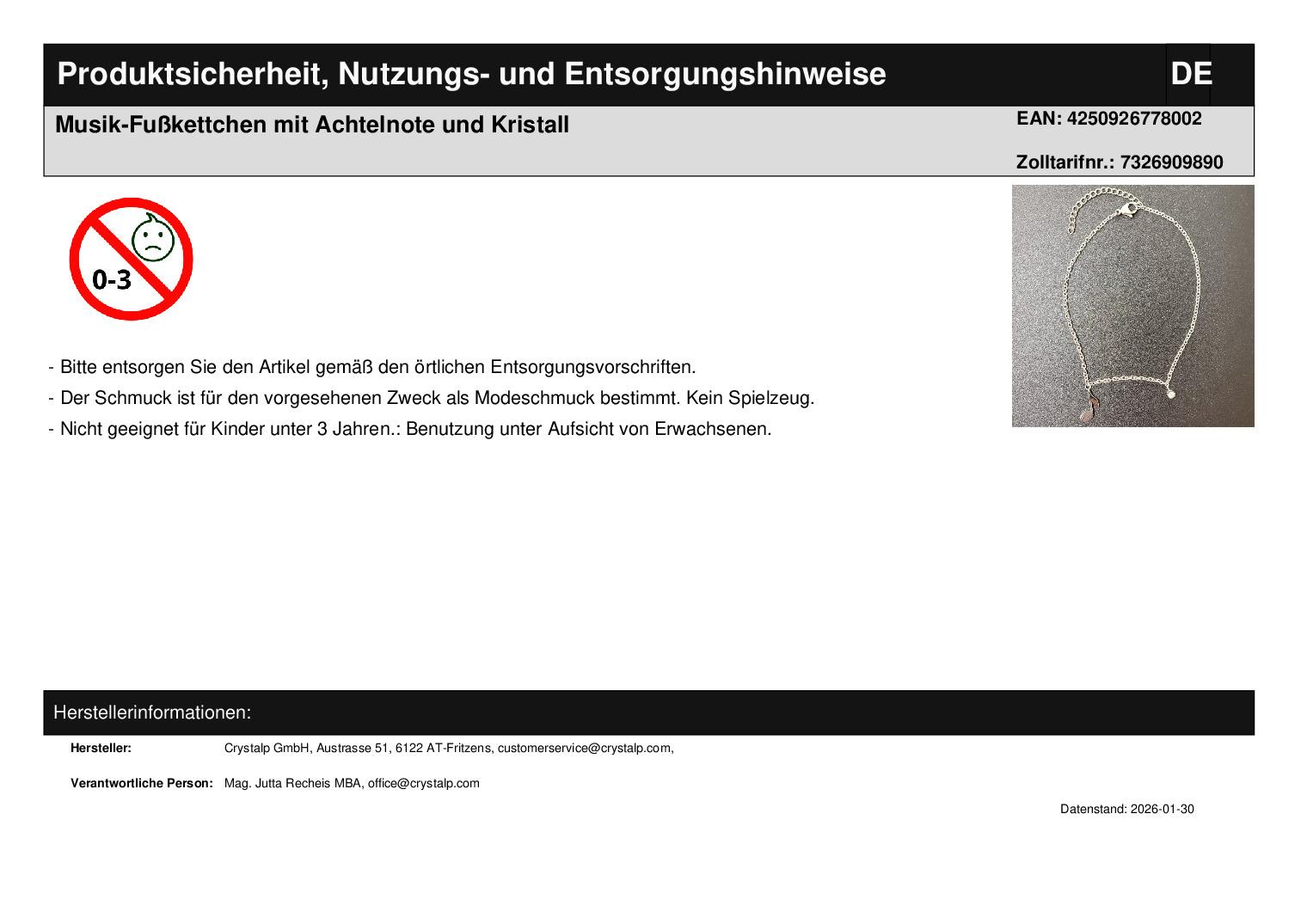 | Titel | Musik-Fußkettchen mit Achtelnote und Kristall |
