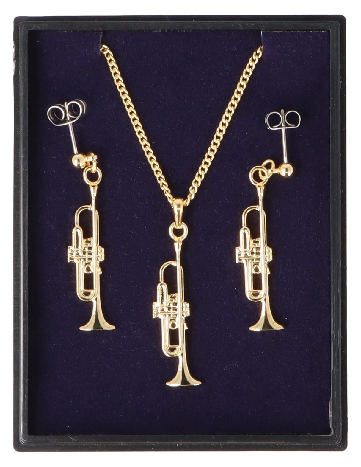 Trompete Ohrhänger und Anhänger mit Kette in Displaybox, versilbert oder vergoldet, Blasmusik - Ausführung: vergoldet