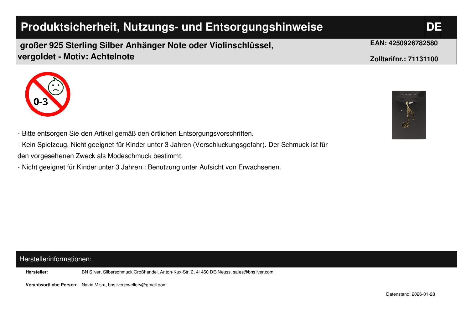 | Titel | großer 925 Sterling Silber Anhänger Note oder Violinschlüssel, vergoldet - Motiv: Achtelnote |