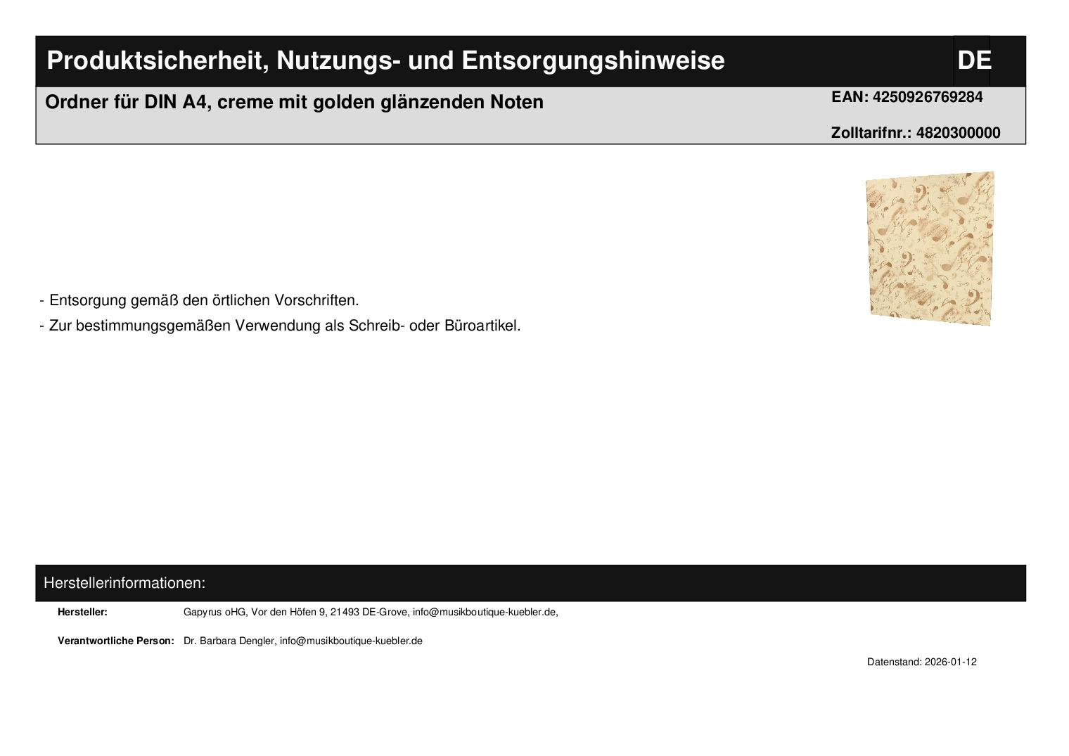 | Titel | Ordner für DIN A4, creme mit golden glänzenden Noten |