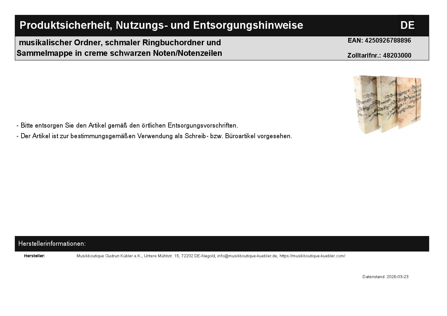 | Titel | musikalischer Ordner, schmaler Ringbuchordner und Sammelmappe in creme schwarzen Noten/Notenzeilen |
