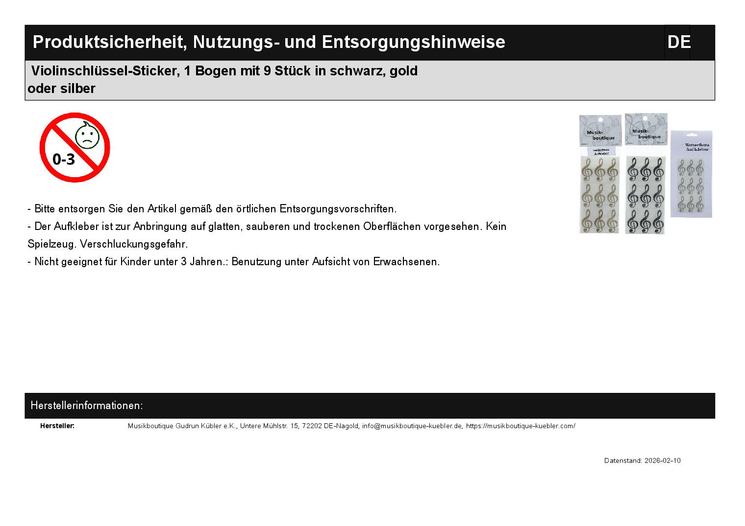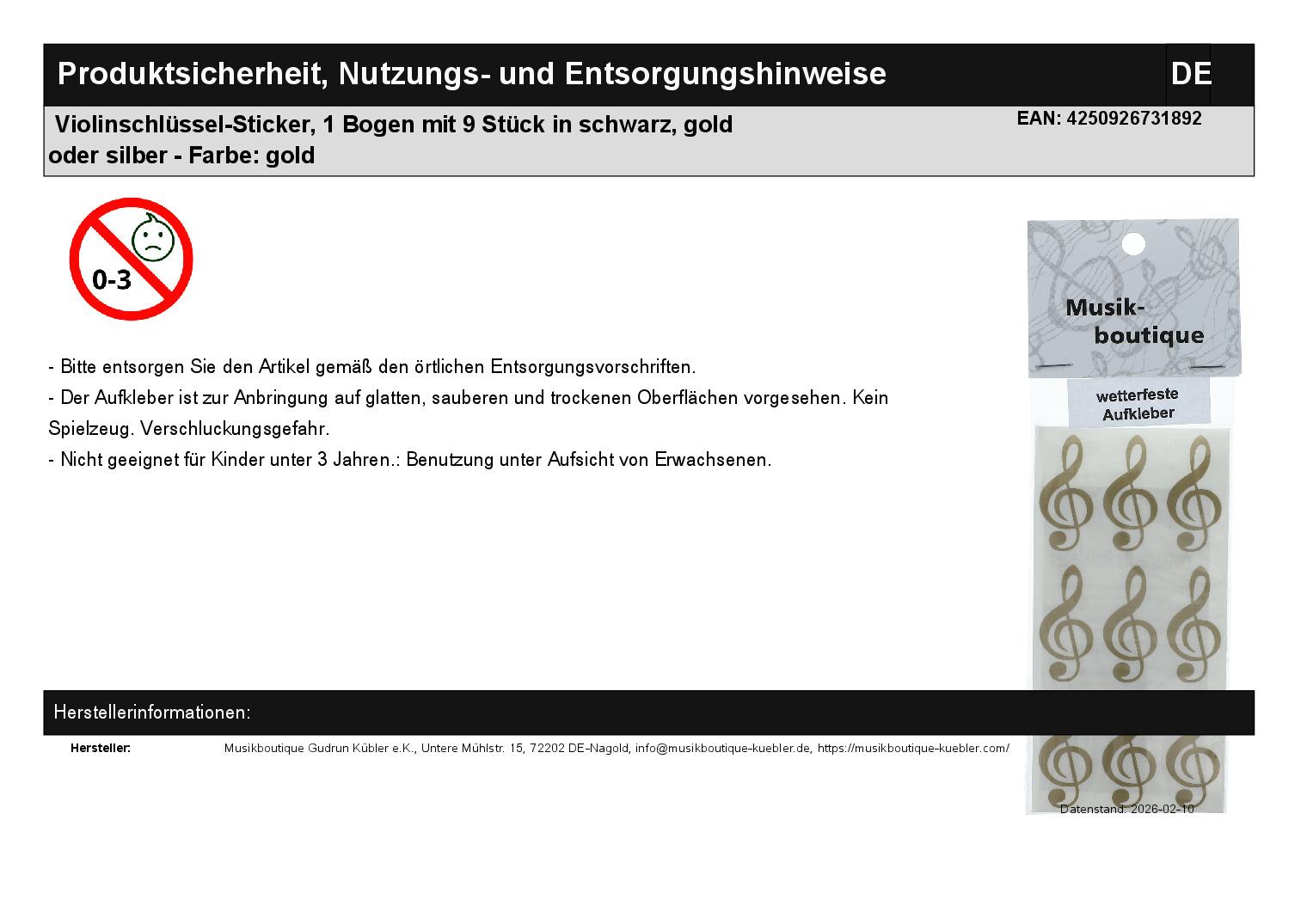 | Titel | Violinschlüssel-Sticker, 1 Bogen mit 9 Stück in schwarz, gold oder silber |