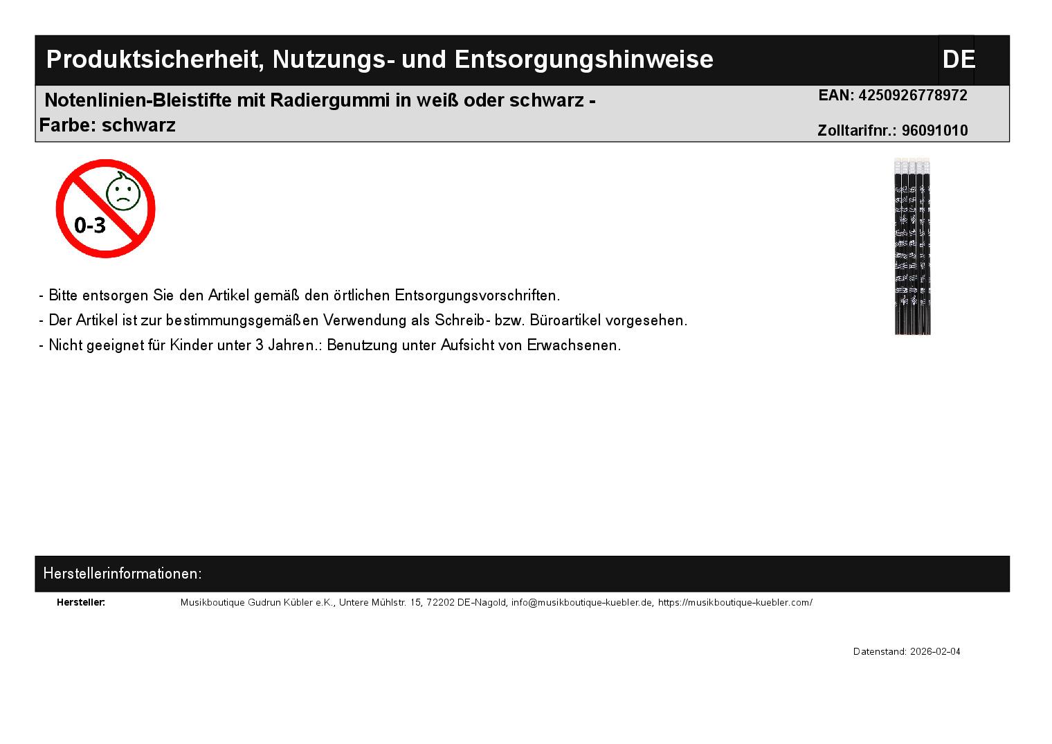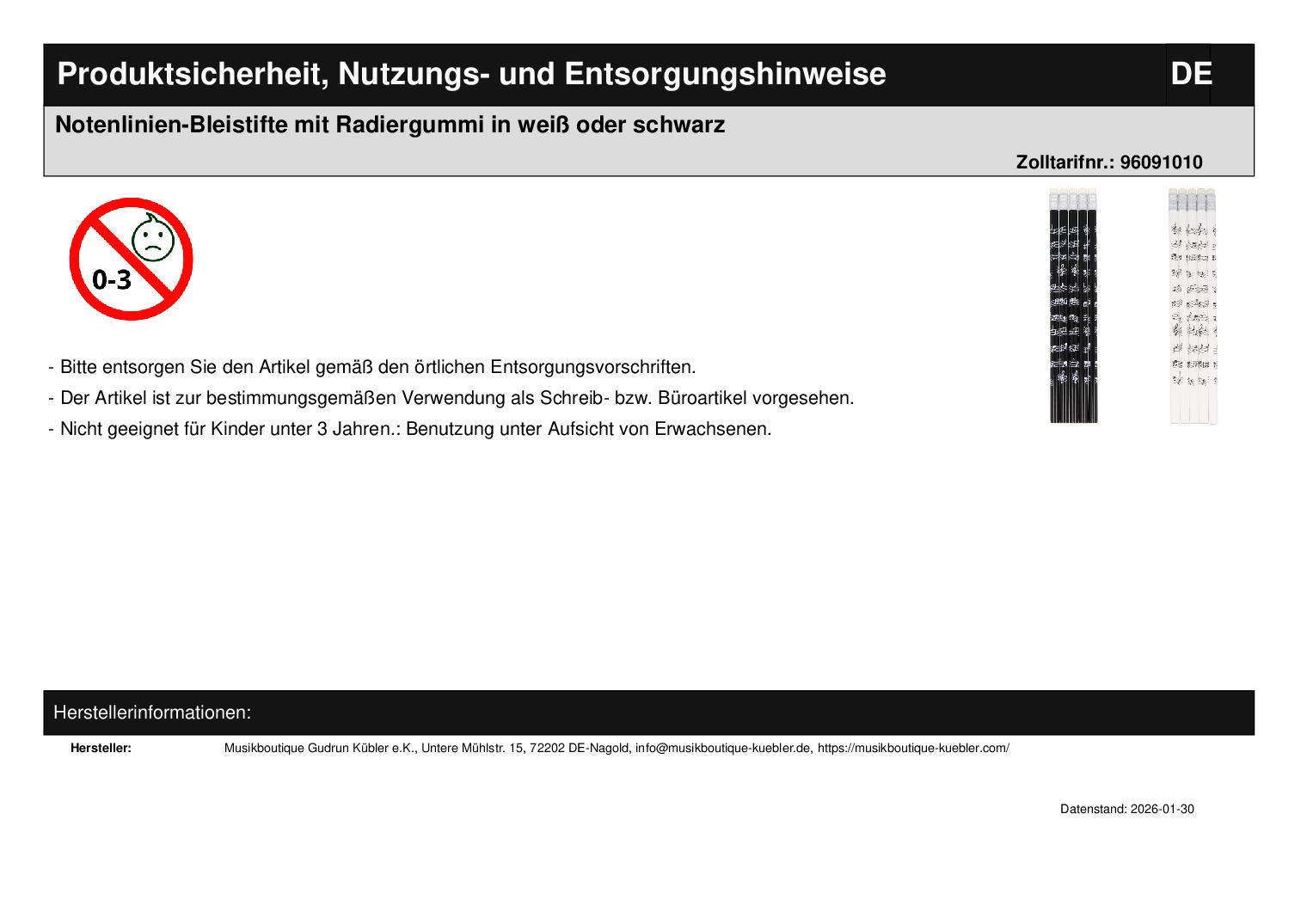 | Titel | Notenlinien-Bleistifte mit Radiergummi in weiß oder schwarz |
