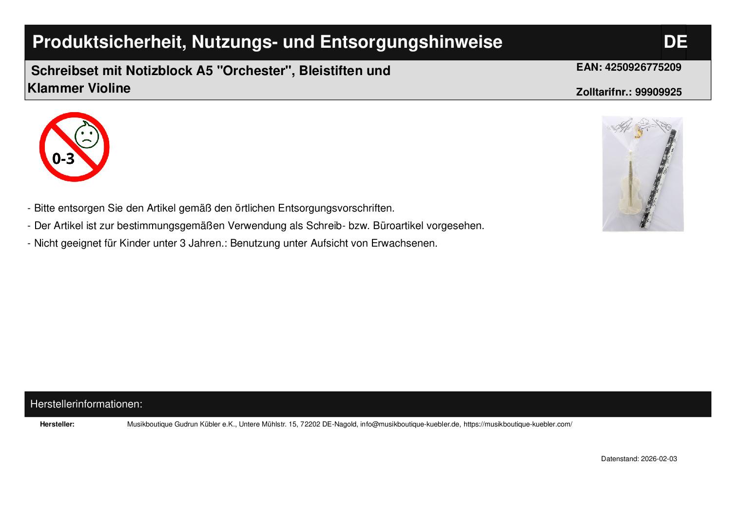 | Titel | Schreibset mit Notizblock A5 "Orchester", Bleistiften und Klammer Violine |