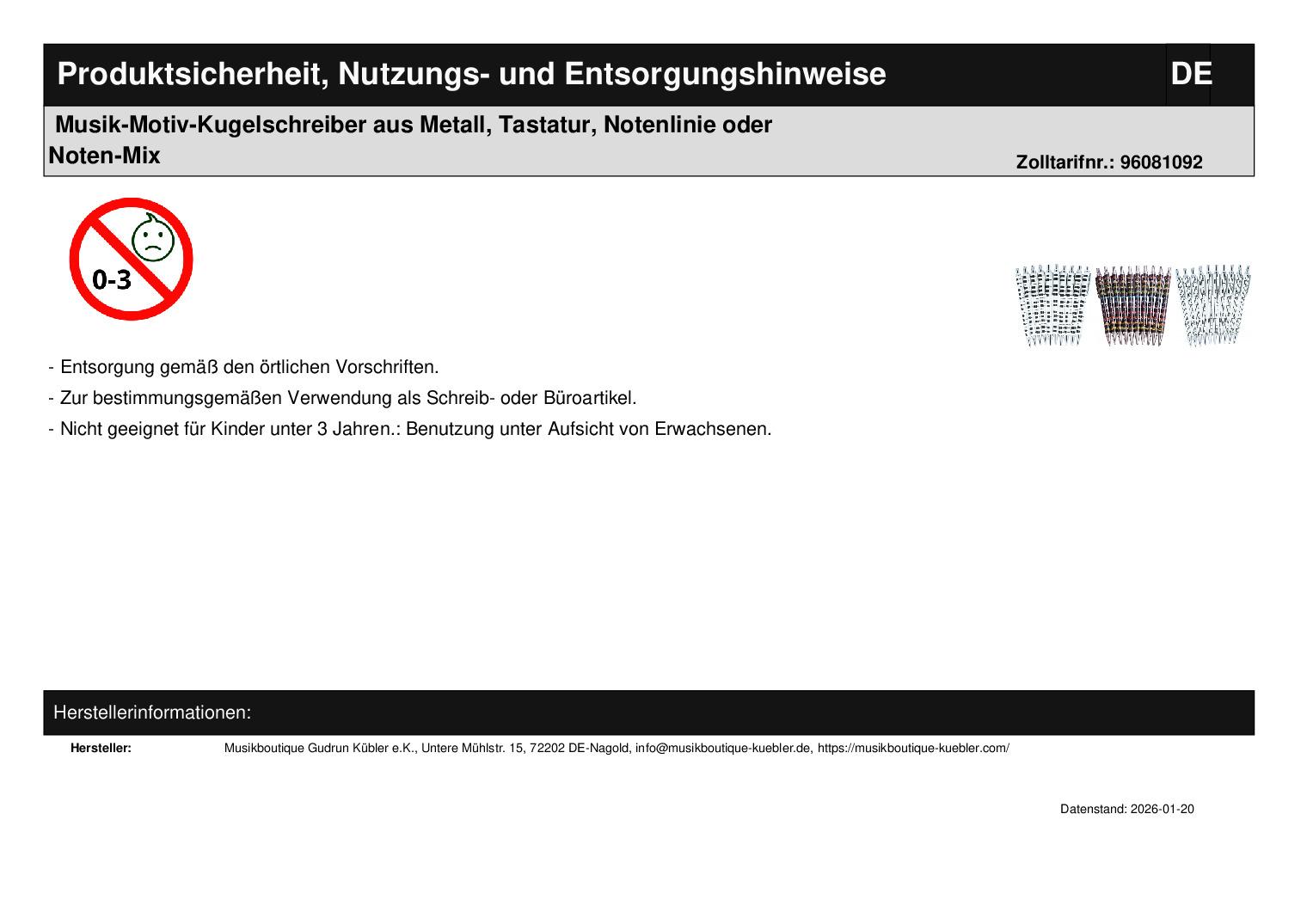 | Titel | Musik-Motiv-Kugelschreiber aus Metall, Tastatur, Notenlinie oder Noten-Mix |