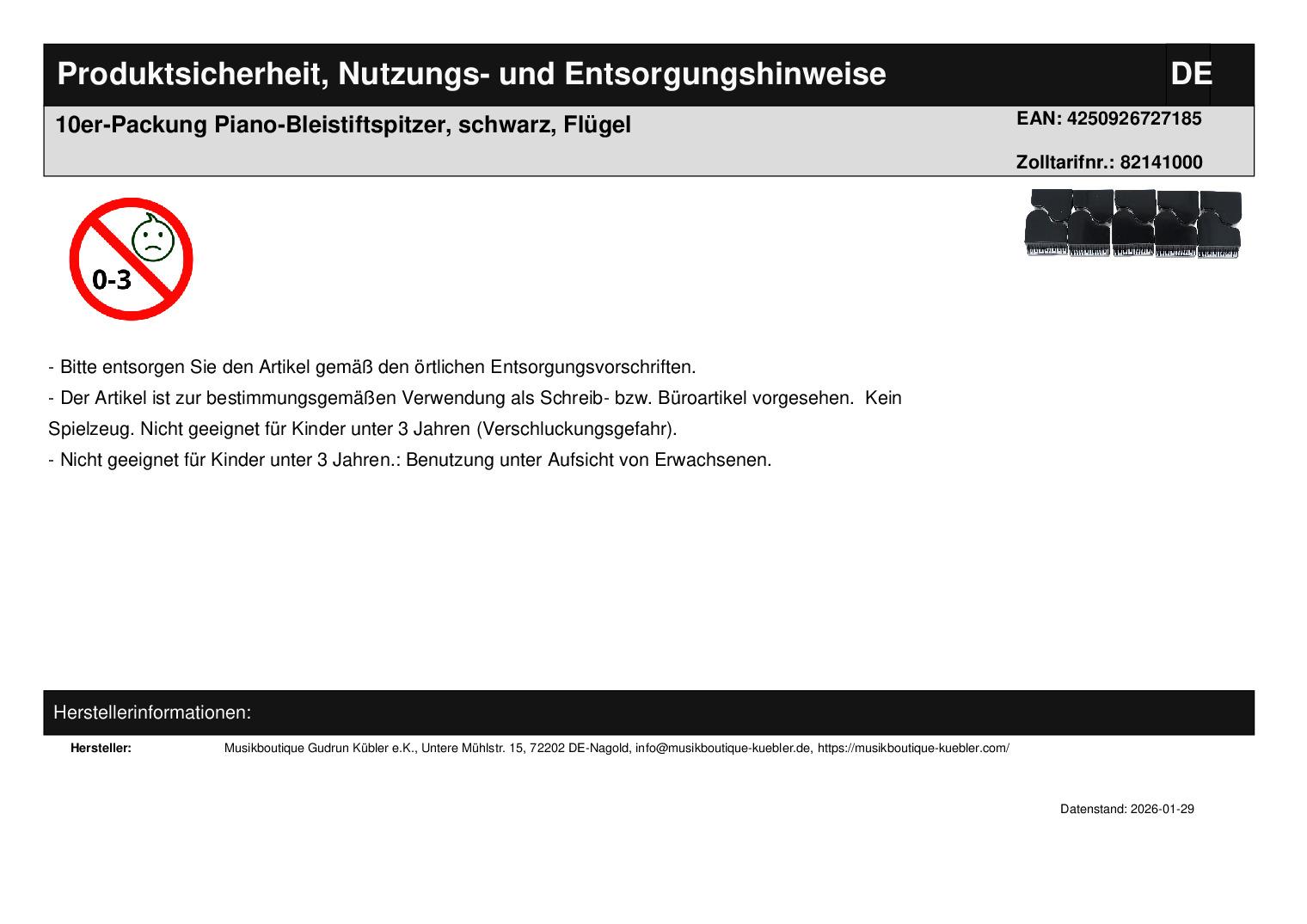 | Titel | 10er-Packung Piano-Bleistiftspitzer, schwarz, Flügel |