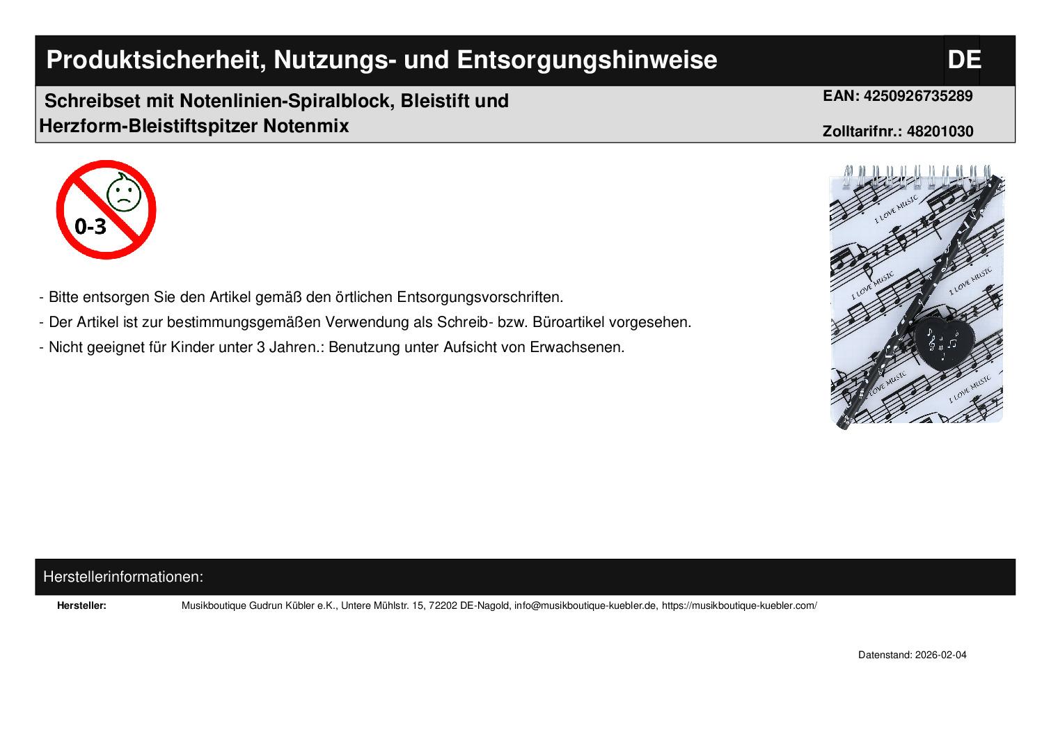 | Titel | Schreibset mit Notenlinien-Spiralblock, Bleistift und Herzform-Bleistiftspitzer Notenmix |