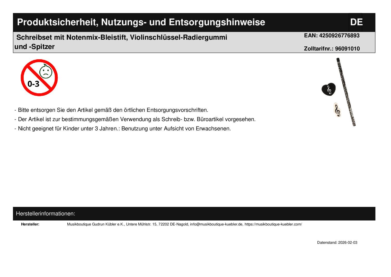 | Titel | Schreibset mit Notenmix-Bleistift, Violinschlüssel-Radiergummi und -Spitzer |