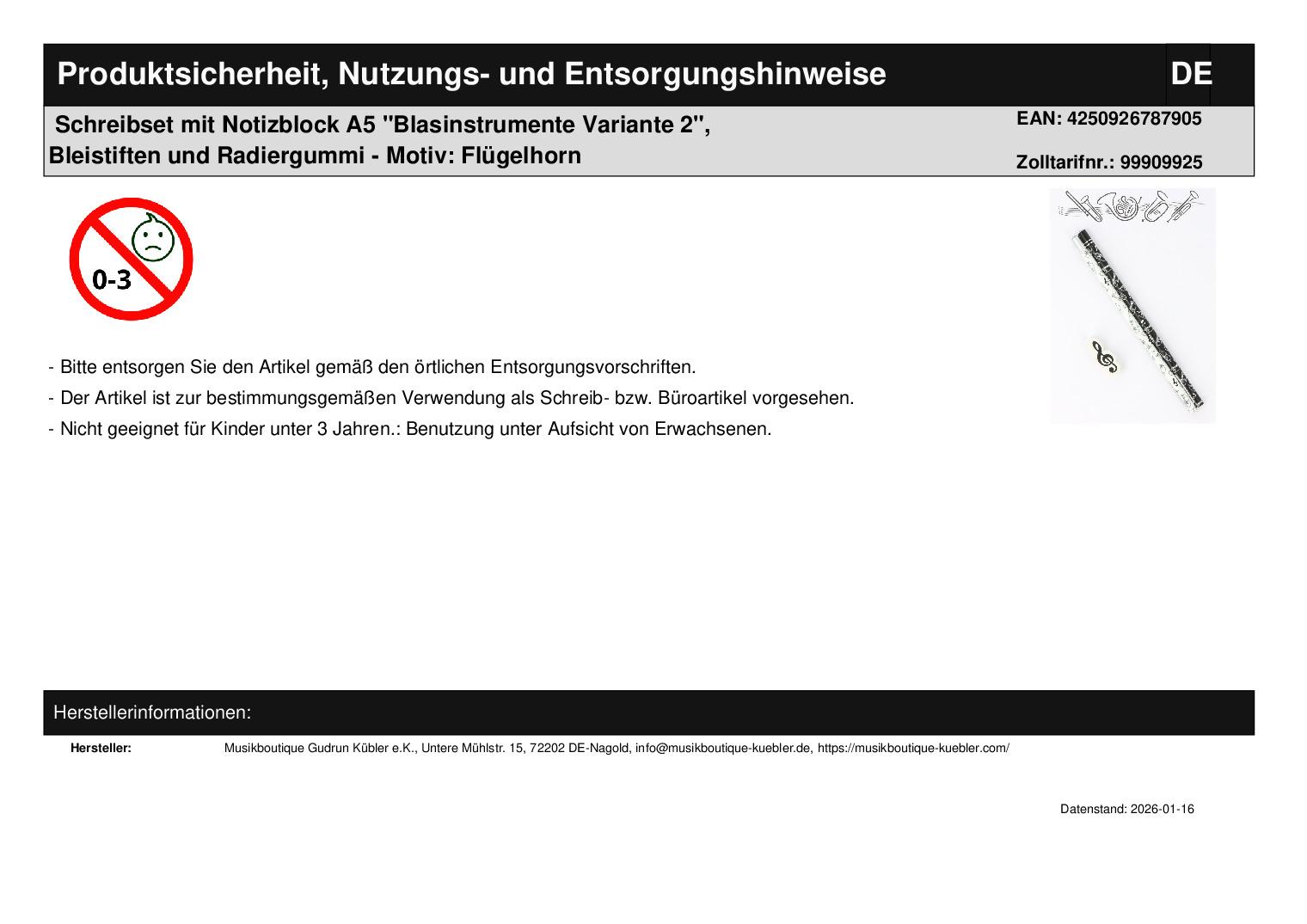 | Titel | Schreibset mit Notizblock A5 "Blasinstrumente Variante 2", Bleistiften und Radiergummi |