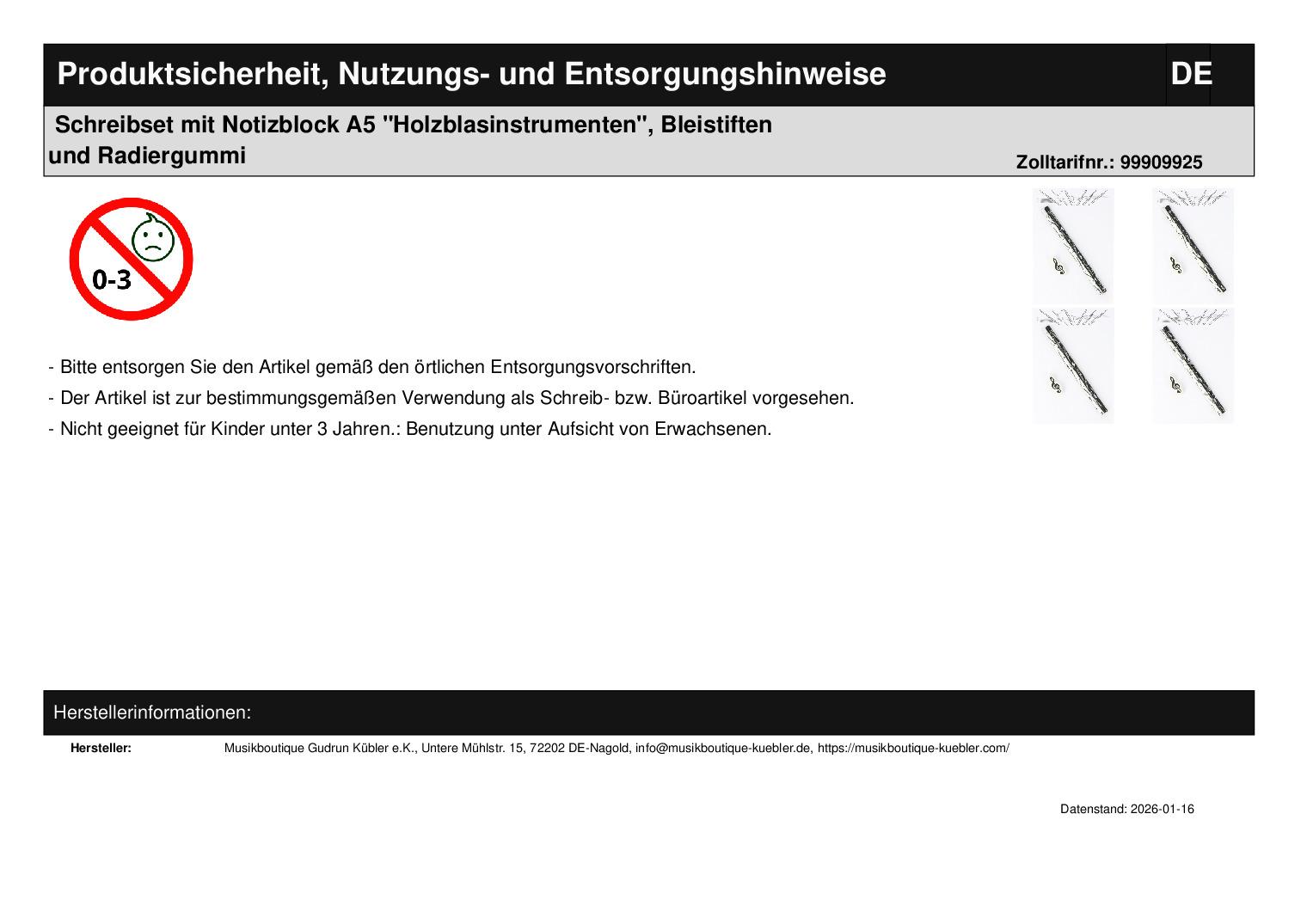 | Titel | Schreibset mit Notizblock A5 "Holzblasinstrumenten", Bleistiften und Radiergummi |