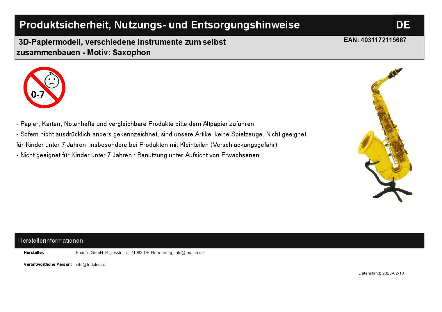 3D-Papiermodell, verschiedene Instrumente zum selbst zusammenbauen - Motiv: Saxophon