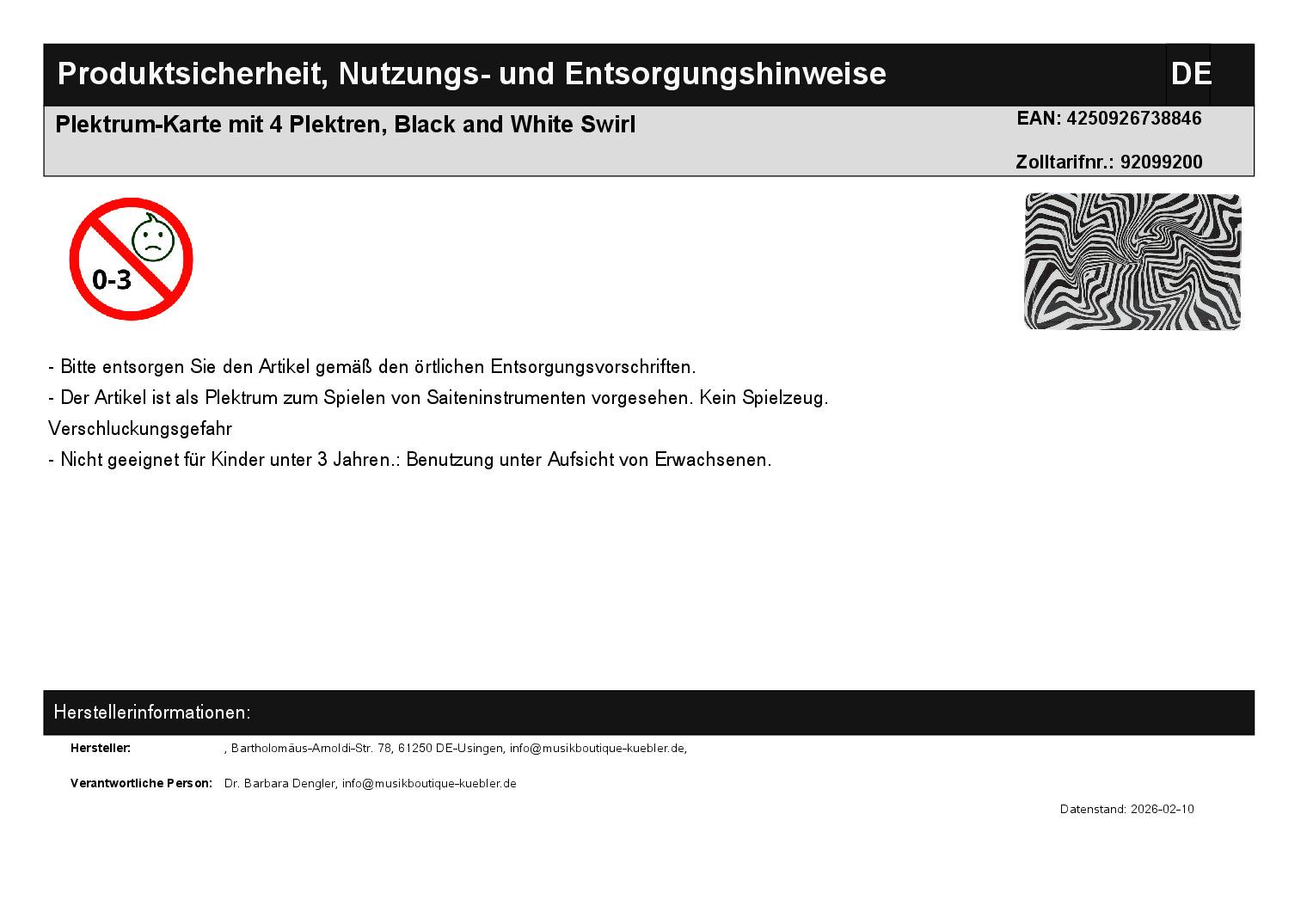 | Titel | Plektrum-Karte mit 4 Plektren, Black and White Swirl |