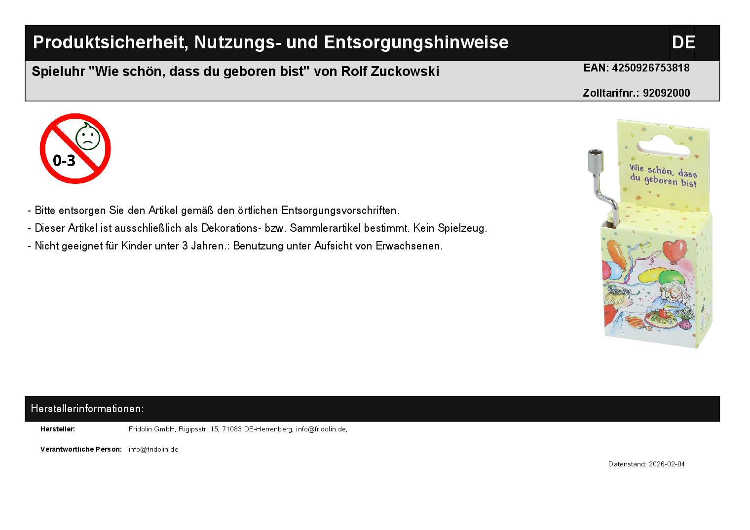 | Titel | Spieluhr "Wie schön, dass du geboren bist" von Rolf Zuckowski |