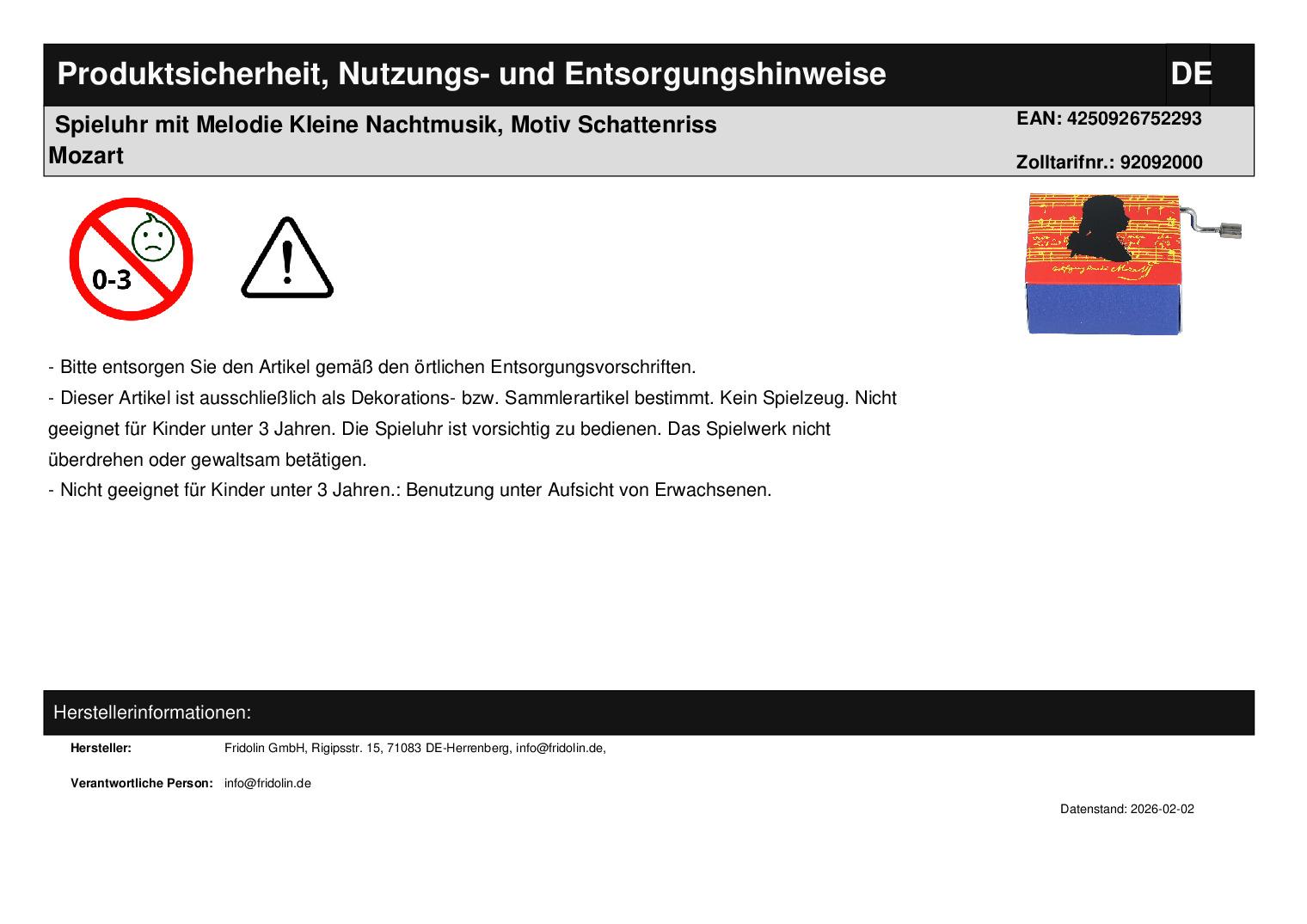 | Titel | Spieluhr mit Melodie Kleine Nachtmusik, Motiv Schattenriss Mozart |